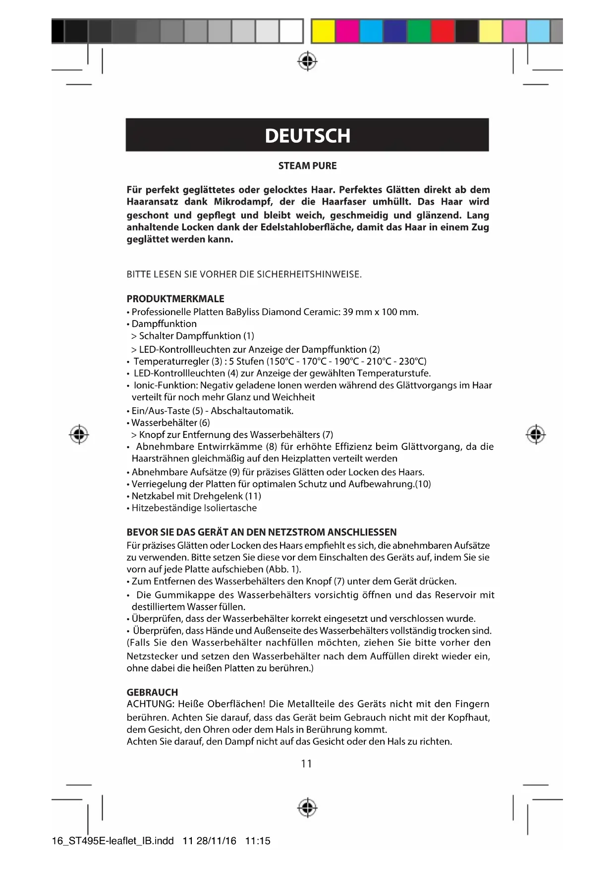 - Put away the straightener with the plates closed together to eectively protect them with the plate locking system (10). 16_ST495E-leaflet_IB.indd 10 28/11/16 11:1511 DEUTSCH STEAM PURE Für perfekt geglättetes oder gelocktes Haar. Perfektes Glätten direkt ab dem Haaransatz dank Mikrodampf, der die Haarfaser umhüllt. Das Haar wird geschont und gepegt und bleibt weich, geschmeidig und glänzend. Lang anhaltende Locken dank der Edelstahloberäche, damit das Haar in einem Zug geglättet werden kann. BITTE LESEN SIE VORHER DIE SICHERHEITSHINWEISE. PRODUKTMERKMALE