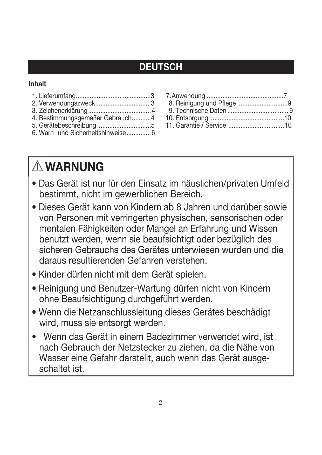 - Das Gerät ist nur für den Einsatz im häuslichen/privaten Umfeld bestimmt, nicht im gewerblichen Bereich.