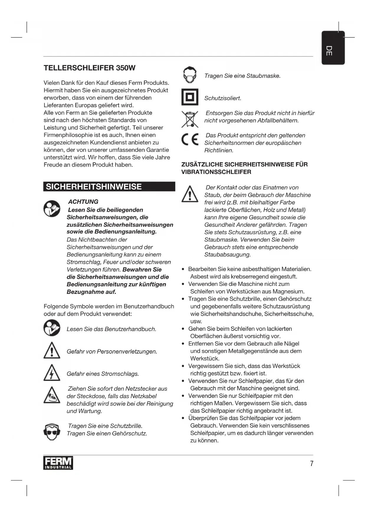 TELLERSCHLEIFER 350W Vielen Dank für den Kauf dieses Ferm Produkts. Hiermit haben Sie ein ausgezeichnetes Produkt erworben, dass von einem der führenden Lieferanten Europas geliefert wird. Alle von Ferm an Sie gelieferten Produkte sind nach den höchsten Standards von Leistung und Sicherheit gefertigt. Teil unserer Firmenphilosophie ist es auch, Ihnen einen ausgezeichneten Kundendienst anbieten zu können, der von unserer umfassenden Garantie unterstützt wird. Wir hoffen, dass Sie viele Jahre Freude an diesem Produkt haben. SICHERHEITSHINWEISE ACHTUNG Lesen Sie die beiliegenden Sicherheitsanweisungen, die zusätzlichen Sicherheitsanweisungen sowie die Bedienungsanleitung. Das Nichtbeachten der Sicherheitsanweisungen und der Bedienungsanleitung kann zu einem Stromschlag, Feuer und/oder schweren Verletzungen führen. Bewahren Sie die Sicherheitsanweisungen und die Bedienungsanleitung zur künftigen Bezugnahme auf. Folgende Symbole werden im Benutzerhandbuch oder auf dem Produkt verwendet: Lesen Sie das Benutzerhandbuch. Gefahr von Personenverletzungen. Gefahr eines Stromschlags. Ziehen Sie sofort den Netzstecker aus der Steckdose, falls das Netzkabel beschädigt wird sowie bei der Reinigung und Wartung. Tragen Sie eine Schutzbrille. Tragen Sie einen Gehörschutz. Tragen Sie eine Staubmaske. Schutzisoliert. Entsorgen Sie das Produkt nicht in hierfür nicht vorgesehenen Abfallbehältern. Das Produkt entspricht den geltenden Sicherheitsnormen der europäischen Richtlinien.