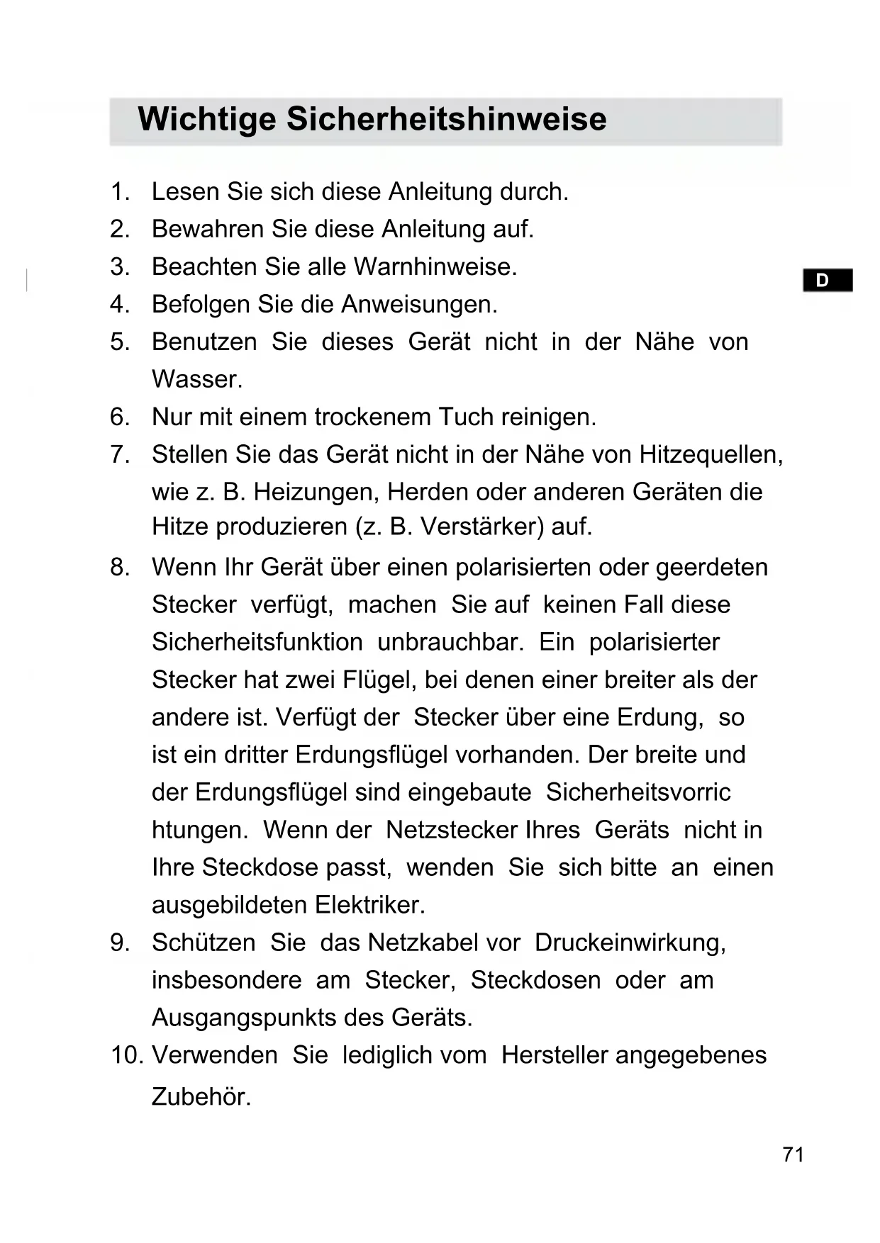 Lesen Sie sich diese Anleitung durch. Bewahren Sie diese Anleitung auf. Beachten Sie alle Warnhinweise. Befolgen Sie die Anweisungen. Benutzen Sie dieses Gerät nicht in der Nähe von Wasser. Nur mit einem trockenem Tuch reinigen. Stellen Sie das Gerät nicht in der Nähe von Hitzequellen, wie z. B. Heizungen, Herden oder anderen Geräten die Hitze produzieren (z. B. Verstärker) auf. Wenn Ihr Gerät über einen polarisierten oder geerdeten Stecker verfügt, machen Sie auf keinen Fall diese Sicherheitsfunktion unbrauchbar. Ein polarisierter Stecker hat zwei Flügel, bei denen einer breiter als der andere ist. Verfügt der Stecker über eine Erdung, so ist ein dritter Erdungsflügel vorhanden. Der breite und der Erdungsflügel sind eingebaute Sicherheitsvorric htungen. Wenn der Netzstecker Ihres Geräts nicht in Ihre Steckdose passt, wenden Sie sich bitte an einen ausgebildeten Elektriker. Schützen Sie das Netzkabel vor Druckeinwirkung, insbesondere am Stecker, Steckdosen oder am Ausgangspunkts des Geräts. Verwenden Sie lediglich vom Hersteller angegebenes Zubehör.72 Das Gerät darf nur dann mit Wagen, Gestellen, Dreifüßen, Halterungen oder Tischen verwendet werden, wenn diese vom Hersteller entsprechend angegeben wurden oder zusammen mit dem Gerät verkauft wurden. Wenn ein Wagen benutzt wird, muss darauf geachtet werden, dass das Gerät nicht zusammen mit dem Wagen umkippt und Verletzungen verursacht. Ziehen Sie bei Gewittern oder bei längerer Nichtbenutzung den Stecker aus der Steckdose. Wenden Sie sich im Wartungsfall nur an ausgebildetes Wartungspersonal. Das Gerät sollte gewartet bzw. repariert werden, nachdem es in irgendeiner Weise beschädigt wurde, wie z. B. bei Beschädigung des Netzkabels, nachdem Flüssigkeiten über das Gerät gegossen wurden oder Gegenstände in das Gerät gelangt sind, es herunter gefallen ist, nicht auf normale Weise funktioniert oder Feuchtigkeit ausgesetzt wurde. Um Feuer und elektrischen Schlägen vorzubeugen, vermeiden Sie es das Gerät Regen oder Feuchtigkeit auszusetzen. Ein Stromschlaggefahrsymbol und ein grafisches Warnsymbol sind zur Vorbeugung an der Unterseite des Geräts angebracht. Übermäßiger Schalldruck von Kopfhörern kann Hörschäden verursachen. Höhere Einstellungen am Equalizer verursachen höhere Signalspannungen am Kopfhörerausgang.