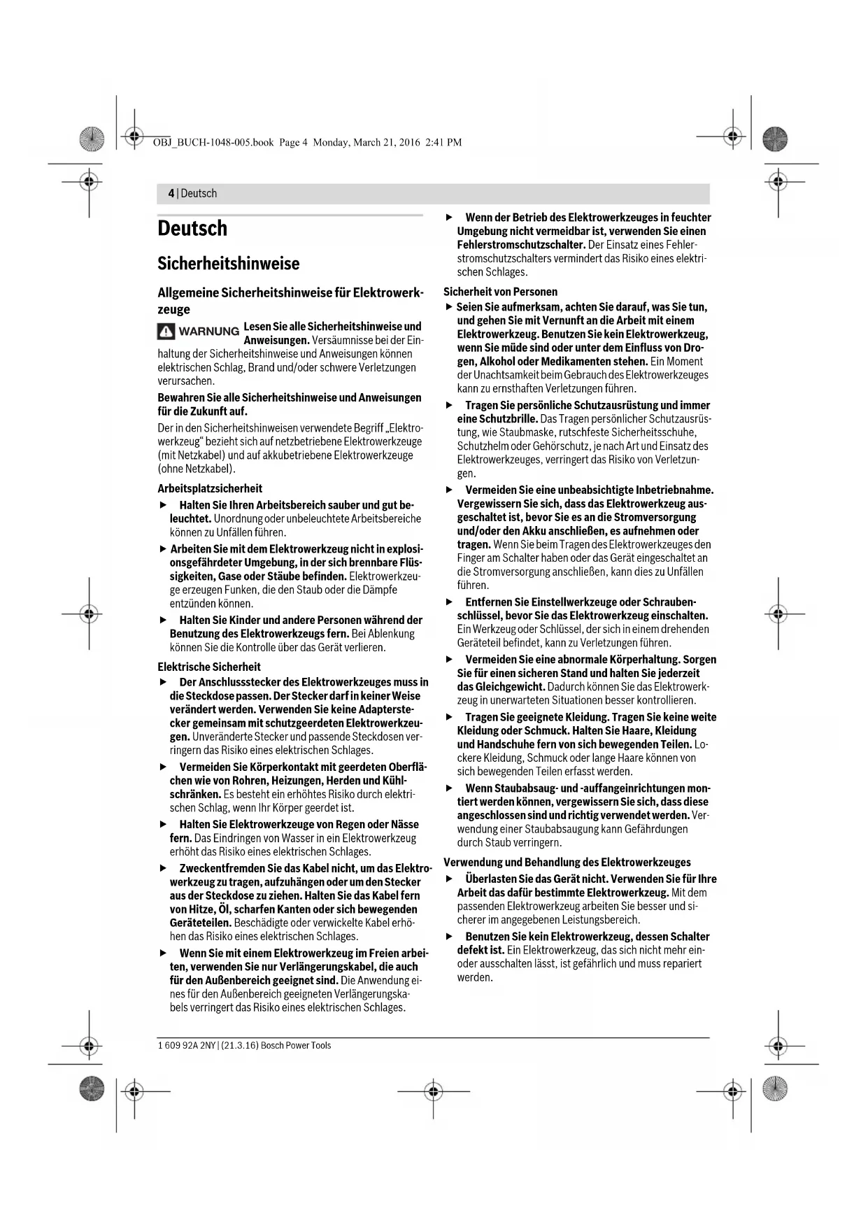 OBJ_BUCH-1048-005.book Page 3 Monday, March 21, 2016 2:41 PM4 | Deutsch 1 609 92A 2NY | (21.3.16) Bosch Power Tools Deutsch Sicherheitshinweise Allgemeine Sicherheitshinweise für Elektrowerk- zeuge Lesen Sie alle Sicherheitshinweise und Anweisungen. Versäumnisse bei der Ein- haltung der Sicherheitshinweise und Anweisungen können elektrischen Schlag, Brand und/oder schwere Verletzungen verursachen. Bewahren Sie alle Sicherheitshinweise und Anweisungen für die Zukunft auf. Der in den Sicherheitshinweisen verwendete Begriff „Elektro- werkzeug“ bezieht sich auf netzbetriebene Elektrowerkzeuge (mit Netzkabel) und auf akkubetriebene Elektrowerkzeuge (ohne Netzkabel). Arbeitsplatzsicherheit Halten Sie Ihren Arbeitsbereich sauber und gut be- leuchtet. Unordnung oder unbeleuchtete Arbeitsbereiche können zu Unfällen führen. Arbeiten Sie mit dem Elektrowerkzeug nicht in explosi- onsgefährdeter Umgebung, in der sich brennbare Flüs- sigkeiten, Gase oder Stäube befinden. Elektrowerkzeu- ge erzeugen Funken, die den Staub oder die Dämpfe entzünden können. Halten Sie Kinder und andere Personen während der Benutzung des Elektrowerkzeugs fern. Bei Ablenkung können Sie die Kontrolle über das Gerät verlieren. Elektrische Sicherheit Der Anschlussstecker des Elektrowerkzeuges muss in die Steckdose passen. Der Stecker darf in keiner Weise verändert werden. Verwenden Sie keine Adapterste- cker gemeinsam mit schutzgeerdeten Elektrowerkzeu- gen. Unveränderte Stecker und passende Steckdosen ver- ringern das Risiko eines elektrischen Schlages. Vermeiden Sie Körperkontakt mit geerdeten Oberflä- chen wie von Rohren, Heizungen, Herden und Kühl- schränken. Es besteht ein erhöhtes Risiko durch elektri- schen Schlag, wenn Ihr Körper geerdet ist. Halten Sie Elektrowerkzeuge von Regen oder Nässe fern. Das Eindringen von Wasser in ein Elektrowerkzeug erhöht das Risiko eines elektrischen Schlages. Zweckentfremden Sie das Kabel nicht, um das Elektro- werkzeug zu tragen, aufzuhängen oder um den Stecker aus der Steckdose zu ziehen. Halten Sie das Kabel fern von Hitze, Öl, scharfen Kanten oder sich bewegenden Geräteteilen. Beschädigte oder verwickelte Kabel erhö- hen das Risiko eines elektrischen Schlages. Wenn Sie mit einem Elektrowerkzeug im Freien arbei- ten, verwenden Sie nur Verlängerungskabel, die auch für den Außenbereich geeignet sind. Die Anwendung ei- nes für den Außenbereich geeigneten Verlängerungska- bels verringert das Risiko eines elektrischen Schlages. Wenn der Betrieb des Elektrowerkzeuges in feuchter Umgebung nicht vermeidbar ist, verwenden Sie einen Fehlerstromschutzschalter. Der Einsatz eines Fehler- stromschutzschalters vermindert das Risiko eines elektri- schen Schlages. Sicherheit von Personen Seien Sie aufmerksam, achten Sie darauf, was Sie tun, und gehen Sie mit Vernunft an die Arbeit mit einem Elektrowerkzeug. Benutzen Sie kein Elektrowerkzeug, wenn Sie müde sind oder unter dem Einfluss von Dro- gen, Alkohol oder Medikamenten stehen. Ein Moment der Unachtsamkeit beim Gebrauch des Elektrowerkzeuges kann zu ernsthaften Verletzungen führen. Tragen Sie persönliche Schutzausrüstung und immer eine Schutzbrille. Das Tragen persönlicher Schutzausrüs- tung, wie Staubmaske, rutschfeste Sicherheitsschuhe, Schutzhelm oder Gehörschutz, je nach Art und Einsatz des Elektrowerkzeuges, verringert das Risiko von Verletzun- gen. Vermeiden Sie eine unbeabsichtigte Inbetriebnahme. Vergewissern Sie sich, dass das Elektrowerkzeug aus- geschaltet ist, bevor Sie es an die Stromversorgung und/oder den Akku anschließen, es aufnehmen oder tragen. Wenn Sie beim Tragen des Elektrowerkzeuges den Finger am Schalter haben oder das Gerät eingeschaltet an die Stromversorgung anschließen, kann dies zu Unfällen führen. Entfernen Sie Einstellwerkzeuge oder Schrauben- schlüssel, bevor Sie das Elektrowerkzeug einschalten. Ein Werkzeug oder Schlüssel, der sich in einem drehenden Geräteteil befindet, kann zu Verletzungen führen. Vermeiden Sie eine abnormale Körperhaltung. Sorgen Sie für einen sicheren Stand und halten Sie jederzeit das Gleichgewicht. Dadurch können Sie das Elektrowerk- zeug in unerwarteten Situationen besser kontrollieren. Tragen Sie geeignete Kleidung. Tragen Sie keine weite Kleidung oder Schmuck. Halten Sie Haare, Kleidung und Handschuhe fern von sich bewegenden Teilen. Lo- ckere Kleidung, Schmuck oder lange Haare können von sich bewegenden Teilen erfasst werden. Wenn Staubabsaug- und -auffangeinrichtungen mon- tiert werden können, vergewissern Sie sich, dass diese angeschlossen sind und richtig verwendet werden. Ver- wendung einer Staubabsaugung kann Gefährdungen durch Staub verringern. Verwendung und Behandlung des Elektrowerkzeuges Überlasten Sie das Gerät nicht. Verwenden Sie für Ihre Arbeit das dafür bestimmte Elektrowerkzeug. Mit dem passenden Elektrowerkzeug arbeiten Sie besser und si- cherer im angegebenen Leistungsbereich. Benutzen Sie kein Elektrowerkzeug, dessen Schalter defekt ist. Ein Elektrowerkzeug, das sich nicht mehr ein- oder ausschalten lässt, ist gefährlich und muss repariert werden. WARNUNG OBJ_BUCH-1048-005.book Page 4 Monday, March 21, 2016 2:41 PMDeutsch | 5 Bosch Power Tools 1 609 92A 2NY | (21.3.16) Ziehen Sie den Stecker aus der Steckdose und/oder entfernen Sie den Akku, bevor Sie Geräteeinstellungen vornehmen, Zubehörteile wechseln oder das Gerät weglegen. Diese Vorsichtsmaßnahme verhindert den un- beabsichtigten Start des Elektrowerkzeuges. Bewahren Sie unbenutzte Elektrowerkzeuge außer- halb der Reichweite von Kindern auf. Lassen Sie Perso- nen das Gerät nicht benutzen, die mit diesem nicht ver- traut sind oder diese Anweisungen nicht gelesen haben. Elektrowerkzeuge sind gefährlich, wenn sie von unerfahrenen Personen benutzt werden. Pflegen Sie Elektrowerkzeuge mit Sorgfalt. Kontrollie- ren Sie, ob bewegliche Teile einwandfrei funktionieren und nicht klemmen, ob Teile gebrochen oder so be- schädigt sind, dass die Funktio