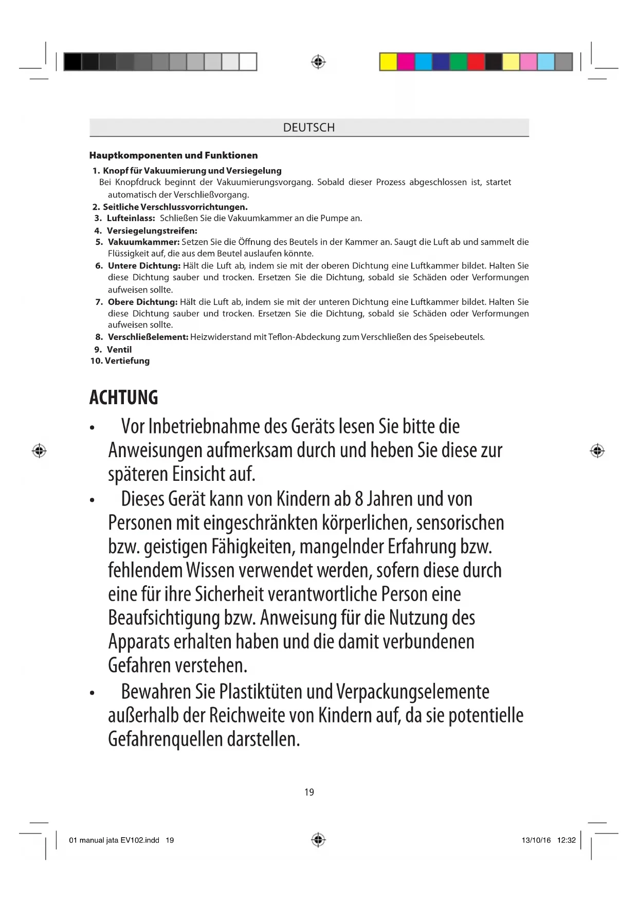 - Die vom Benutzer durchzuführenden Reinigungs- und Wartungsarbeiten dürfen nur von Kindern über 8 Jahren unter Aufsicht durchgeführt werden. 01 manual jata EV102.indd 20 13/10/16 12:3221