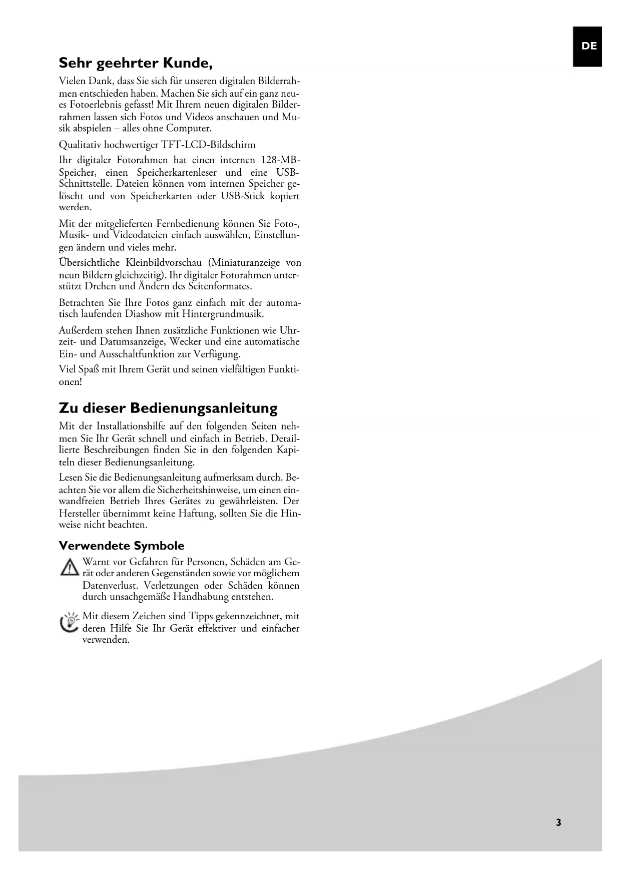Vielen Dank, dass Sie sich für unseren digitalen Bilderrahmen entschieden haben. Machen Sie sich auf ein ganz neu- es Fotoerlebnis gefasst! Mit Ihrem neuen digitalen Bilderrahmen lassen sich Fotos und Videos anschauen und Musik abspielen – alles ohne Computer.
