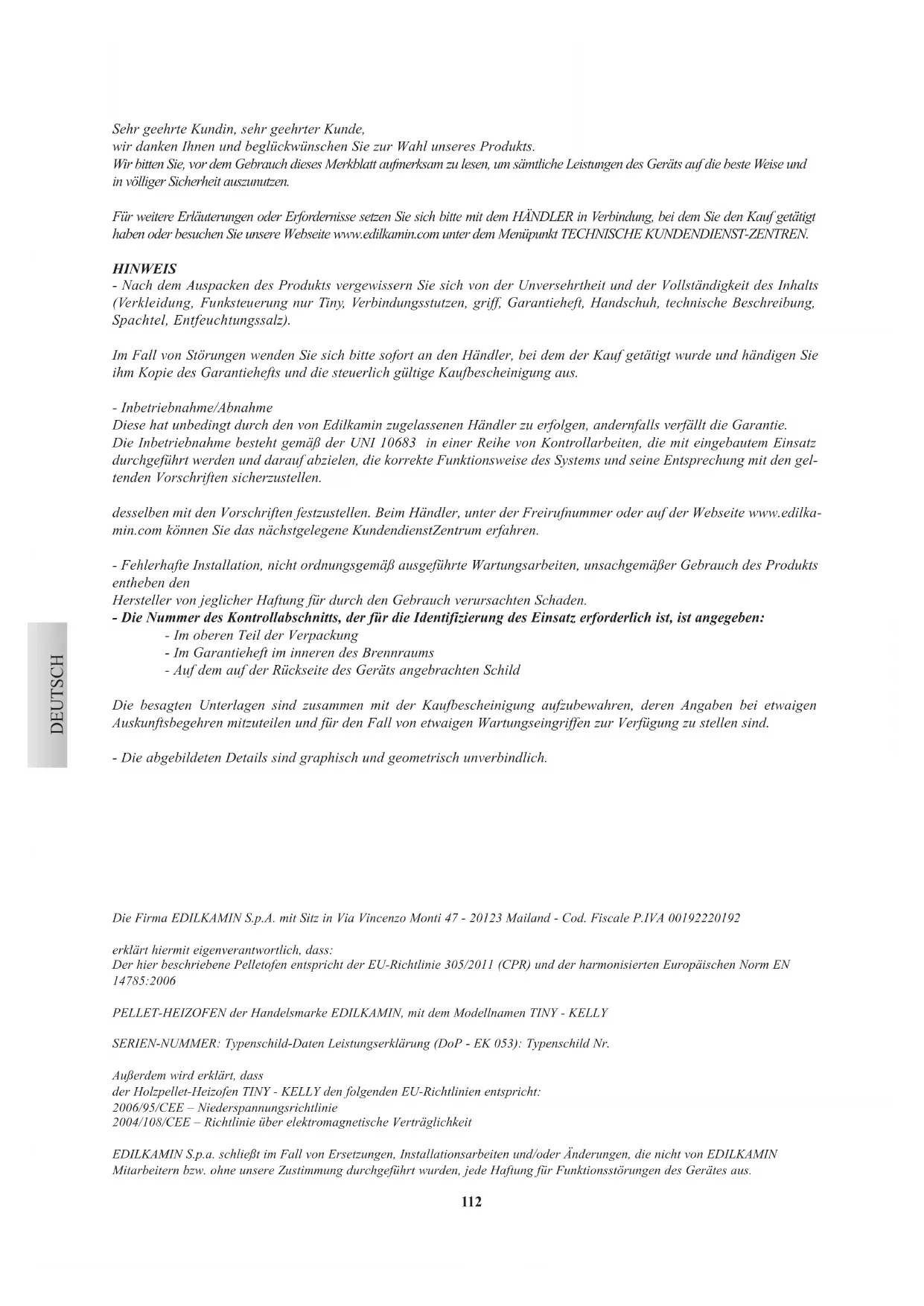 GlassKamin (cód. 155240) Útil para la limpieza del vidrio cerámico Bidón aspira Útil para la limpieza del hogar112 Sehr geehrte Kundin, sehr geehrter Kunde, wir danken Ihnen und beglückwünschen Sie zur Wahl unseres Produkts. Wir bitten Sie, vor dem Gebrauch dieses Merkblatt aufmerksam zu lesen, um sämtliche Leistungen des Geräts auf die beste Weise und in völliger Sicherheit auszunutzen. Für weitere Erläuterungen oder Erfordernisse setzen Sie sich bitte mit dem HÄNDLER in Verbindung, bei dem Sie den Kauf getätigt haben oder besuchen Sie unsere Webseite www.edilkamin.com unter dem Menüpunkt TECHNISCHE KUNDENDIENST-ZENTREN. HINWEIS - Nach dem Auspacken des Produkts vergewissern Sie sich von der Unversehrtheit und der Vollständigkeit des Inhalts (Verkleidung, Funksteuerung nur Tiny, Verbindungsstutzen, griff, Garantieheft, Handschuh, technische Beschreibung, Spachtel, Entfeuchtungssalz). Im Fall von Störungen wenden Sie sich bitte sofort an den Händler, bei dem der Kauf getätigt wurde und händigen Sie ihm Kopie des Garantiehefts und die steuerlich gültige Kaufbescheinigung aus. - Inbetriebnahme/Abnahme Diese hat unbedingt durch den von Edilkamin zugelassenen Händler zu erfolgen, andernfalls verfällt die Garantie. Die Inbetriebnahme besteht gemäß der UNI 10683 in einer Reihe von Kontrollarbeiten, die mit eingebautem Einsatz durchgeführt werden und darauf abzielen, die korrekte Funktionsweise des Systems und seine Entsprechung mit den gel- tenden Vorschriften sicherzustellen. desselben mit den Vorschriften festzustellen. Beim Händler, unter der Freirufnummer oder auf der Webseite www.edilka- min.com können Sie das nächstgelegene KundendienstZentrum erfahren. - Fehlerhafte Installation, nicht ordnungsgemäß ausgeführte Wartungsarbeiten, unsachgemäßer Gebrauch des Produkts entheben den Hersteller von jeglicher Haftung für durch den Gebrauch verursachten Schaden. - Die Nummer des Kontrollabschnitts, der für die Identifizierung des Einsatz erforderlich ist, ist angegeben: - Im oberen Teil der Verpackung - Im Garantieheft im inneren des Brennraums - Auf dem auf der Rückseite des Geräts angebrachten Schild Die besagten Unterlagen sind zusammen mit der Kaufbescheinigung aufzubewahren, deren Angaben bei etwaigen Auskunftsbegehren mitzuteilen und für den Fall von etwaigen Wartungseingriffen zur Verfügung zu stellen sind. - Die abgebildeten Details sind graphisch und geometrisch unverbindlich. DEUTSCH Die Firma EDILKAMIN S.p.A. mit Sitz in Via Vincenzo Monti 47 - 20123 Mailand - Cod. Fiscale P.IVA 00192220192 erklärt hiermit eigenverantwortlich, dass: Der hier beschriebene Pelletofen entspricht der EU-Richtlinie 305/2011 (CPR) und der harmonisierten Europäischen Norm EN 14785:2006 PELLET-HEIZOFEN der Handelsmarke EDILKAMIN, mit dem Modellnamen TINY - KELLY SERIEN-NUMMER: Typenschild-Daten Leistungserklärung (DoP - EK 053): Typenschild Nr. Außerdem wird erklärt, dass der Holzpellet-Heizofen TINY - KELLY den folgenden EU-Richtlinien entspricht: 2006/95/CEE – Niederspannungsrichtlinie 2004/108/CEE – Richtlinie über elektromagnetische Verträglichkeit EDILKAMIN S.p.a. schließt im Fall von Ersetzungen, Installationsarbeiten und/oder Änderungen, die nicht von EDILKAMIN Mitarbeitern bzw. ohne unsere Zustimmung durchgeführt wurden, jede Haftung für Funktionsstörungen des Gerätes aus.113 BETRIEBSWEISE Die Öfen TINY - KELLY erwärmen die Luft, indem sie Holz-Pellet als Brennstoff verwenden, dessen Verbrennung elektronisch gesteuert wird. Nachfolgend wird deren Betriebsweise beschrieben (die Buchstaben beziehen sich auf die Abbildung 1). Der Brennstoff (Pellet) wird dem Aufbewahrungsbehälter entnommen (A) und, und mittels einer durch einen Getriebemotor (C) angetriebenen Förderschnecke (B) in den Verbrennungstiegel (D) befördert. Das Anzünden des Pellet erfolgt durch von einem elektrischen Widerstand (E) erzeugte Heißluft, die mittels eines Rauchabzugsgebläses (F), und vom Stutzen (G) im unteren Teil des Ofens abgezogen. Die Öfen sehen die Kanalisierung der Warnluft vor, um einen angrenzenden Raum zu heizen. Für sie Kanalisierung der Warmluft sind drei Auslassstutzen (auf der Rückseite, auf der Seite und auf dem Oberteil) vorgesehen. Verwenden Sie den am besten geeigneten (folglich sind die anderen Stutzen zu verschließen), indem sie ihn mit dem auf Wunsch erhältlichen KIT 8 verbinden. Der Feuerraum ist mit Gusseisen verkleidet, vorne von zwei übereinander liegenden Türen verschlossen. - Eine äußere Tür aus Glaskeramik (für das Öffnen den spe- ziellen Hitzeschutzhandschuh verwenden). - Eine interne Tür aus Glaskeramik in Kontakt mit dem Feuer. Die Brennstoffmenge, der Rauchabzug, die Versorgung mit Verbrennungsluft werden von einer, mit Software ausge- statteten elektronischen Schaltkarte gesteuert, um eine Verbrennung mit hohen Wirkungsgrad und einen niedrigen Schadstoffausstoß zu gewährleisten. Alle Betriebsphasen können durch Funksteuerung verwaltet werden (Ausstattung des Modells Tiny). Während für das Modell Kelly auf der linken Seite das Bedienfeld (M) angebracht ist, das die Bedienung und die Anzeige aller Funktionsphasen ermöglicht. Für das Modell Kelly ist auf Wunsch eine Fernbedienung für die Verwaltung der wichtigsten Funktionen erhältlich. Der Ofen ist mit einem seriellen Anschluss für die Verbindung mit einem auf Wusch erhältlichen Kabel (TINY Art.-Nr. 62140 - KELLY Art.-Nr. 620550) versehen. mit Fernschaltvorrichtungen versehen (wie Telefonschalter, Zeitthermostaten, usw.). SICHERHEITSHINWEISE Die Öfen TINY - KELLY wurden entwickelt, um mittels einer automatischen Verbrennung von Pellet im Feuerraum den Raum, in dem sie sich befinden, mittels Abstrahlung und Ausstoß der Warmluft, die aus dem Frontgitter austritt, zu heizen und den angrenzenden Raum mittels der vom Stutzen auf der Rückseite, auf der Seite oder auf dem Oberteil kanalisierten Luft.