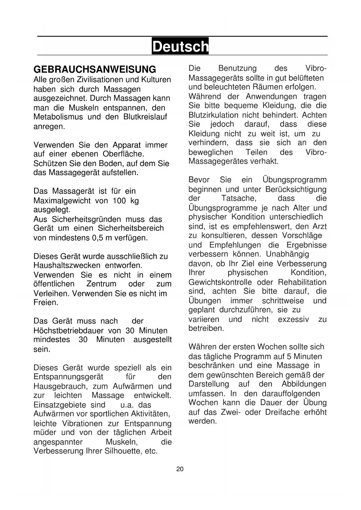 WARNING. Bei bestimmten Krankheiten kann die Benutzung des Vibro- Massagegerats schädlich und)sagar gefährlich sein. Es handelt sichthere um Thrombose oder Veranlagung zur Thrombose (Bildung von Blutgerinseln), Krampfadern mit Thrombose, Herz-Kreislaufkrankheiten (Schwachung des Herzmuskels, Arteriosklerose). In diesen Fällonsolle ein Arzt konsultiert werden.