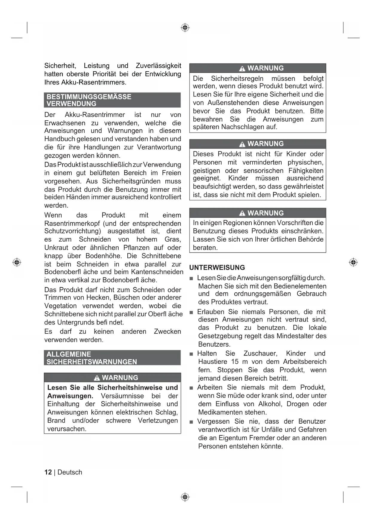 Pièces détachées et accessoires vendus séparément Remarque Avertissement RAC13312 | Deutsch Sicherheit, Leistung und Zuverlässigkeit hatten oberste Priorität bei der Entwicklung Ihres Akku-Rasentrimmers. BESTIMMUNGSGEMÄSSE VERWENDUNG Der Akku-Rasentrimmer ist nur von Erwachsenen zu verwenden, welche die Anweisungen und Warnungen in diesem Handbuch gelesen und verstanden haben und die für ihre Handlungen zur Verantwortung gezogen werden können. Das Produkt ist ausschließlich zur Verwendung in einem gut belüfteten Bereich im Freien vorgesehen. Aus Sicherheitsgründen muss das Produkt durch die Benutzung immer mit beiden Händen immer ausreichend kontrolliert werden. Wenn das Produkt mit einem Rasentrimmerkopf (und der entsprechenden Schutzvorrichtung) ausgestattet ist, dient es zum Schneiden von hohem Gras, Unkraut oder ähnlichen Pfl anzen auf oder knapp über Bodenhöhe. Die Schnittebene ist beim Schneiden in etwa parallel zur Bodenoberfl äche und beim Kantenschneiden in etwa vertikal zur Bodenoberfl äche. Das Produkt darf nicht zum Schneiden oder Trimmen von Hecken, Büschen oder anderer Vegetation verwendet werden, wobei die Schnittebene sich nicht parallel zur Oberfl äche des Untergrunds befi ndet. Es darf zu keinen anderen Zwecken verwenden werden. ALLGEMEINE SICHERHEITSW ARNUNGEN WARNUNG Lesen Sie alle Sicherheitshinweise und Anweisungen. Versäumnisse bei der Einhaltung der Sicherheitshinweise und Anweisungen können elektrischen Schlag, Brand und/oder schwere Verletzungen verursachen. WARNUNG Die Sicherheitsregeln müssen befolgt werden, wenn dieses Produkt benutzt wird. Lesen Sie für Ihre eigene Sicherheit und die von Außenstehenden diese Anweisungen bevor Sie das Produkt benutzen. Bitte bewahren Sie die Anweisungen zum späteren Nachschlagen auf. WARNUNG Dieses Produkt ist nicht für Kinder oder Personen mit verminderten physischen, geistigen oder sensorischen Fähigkeiten geeignet. Kinder müssen ausreichend beaufsichtigt werden, so dass gewährleistet ist, dass sie nicht mit dem Produkt spielen. WARNUNG In einigen Regionen können Vorschriften die Benutzung dieses Produkts einschränken. Lassen Sie sich von Ihrer örtlichen Behörde beraten. UNTER WEISUNG ■ Lesen Sie die Anweisungen sorgfältig durch. Machen Sie sich mit den Bedienelementen und dem ordnungsgemäßen Gebrauch des Produktes vertraut. ■ Erlauben Sie niemals Personen, die mit diesen Anweisungen nicht vertraut sind, das Produkt zu benutzen. Die lokale Gesetzgebung regelt das Mindestalter des Benutzers. ■ Halten Sie Zuschauer, Kinder und Haustiere 15 m von dem Arbeitsbereich fern. Stoppen Sie das Produkt, wenn jemand diesen Bereich betritt. ■ Arbeiten Sie niemals mit dem Produkt, wenn Sie müde oder krank sind, oder unter dem Einfluss von Alkohol, Drogen oder Medikamenten stehen. ■ Vergessen Sie nie, dass der Benutzer verantwortlich ist für Unfälle und Gefahren die an Eigentum Fremder oder an anderen Personen entstehen könnte.13 Deutsch |
