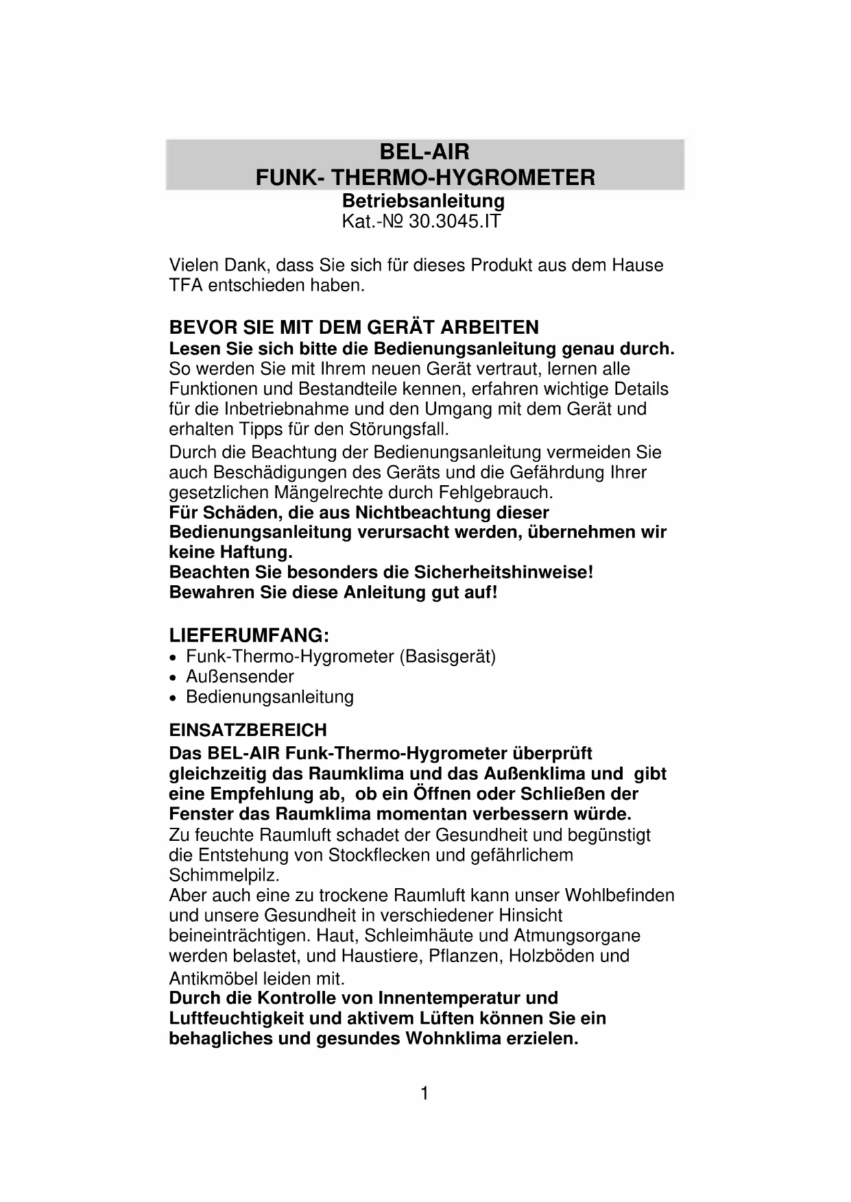 85*135MM1 BEL-AIR FUNK- THERMO-HYGROMETER Betriebsanleitung Kat.-Nr. 30.3045.IT Vielen Dank, dass Sie sich für dieses Produkt aus dem Hause TFA entschieden haben. BEVOR SIE MIT DEM GERÄT ARBEITEN Lesen Sie sich bitte die Bedienungsanleitung genau durch. So werden Sie mit Ihrem neuen Gerät vertraut, lernen alle Funktionen und Bestandteile kennen, erfahren wichtige Details für die Inbetriebnahme und den Umgang mit dem Gerät und erhalten Tipps für den Störungsfall. Durch die Beachtung der Bedienungsanleitung vermeiden Sie auch Beschädigungen des Geräts und die Gefährdung Ihrer gesetzlichen Mängelrechte durch Fehlgebrauch. Für Schäden, die aus Nichtbeachtung dieser Bedienungsanleitung verursacht werden, übernehmen wir keine Haftung. Beachten Sie besonders die Sicherheitshinweise! Bewahren Sie diese Anleitung gut auf! LIEFERUMFANG: Funk-Thermo-Hygrometer (Basisgerät) Außensender Bedienungsanleitung EINSATZBEREICH Das BEL-AIR Funk-Thermo-Hygrometer überprüft gleichzeitig das Raumklima und das Außenklima und gibt eine Empfehlung ab, ob ein Öffnen oder Schließen der Fenster das Raumklima momentan verbessern würde. Zu feuchte Raumluft schadet der Gesundheit und begünstigt die Entstehung von Stockflecken und gefährlichem Schimmelpilz. Aber auch eine zu trockene Raumluft kann unser Wohlbefinden und unsere Gesundheit in verschiedener Hinsicht beineinträchtigen. Haut, Schleimhäute und Atmungsorgane werden belastet, und Haustiere, Pflanzen, Holzböden und Antikmöbel leiden mit. Durch die Kontrolle von Innentemperatur und Luftfeuchtigkeit und aktivem Lüften können Sie ein behagliches und gesundes Wohnklima erzielen.2 Ist die Raumluft zu feucht, erscheint Lüften im Winter, wenn es draußen kalt, nass und ebenfalls feucht ist, zunächst unsinnig. Aber kalte Luft kann nur wenig oder gar keine Feuchtigkeit aufnehmen. Gelangt diese Luft in die Wohnung, wird sie erwärmt. Und nun kann die Luft ein Vielfaches an Wasserdampf aufnehmen. Dieser Zusammenhang zwischen Temperatur und relativer Luftfeuchtigkeit wird von Ihrem BEL-AIR Funk-Thermo- Hygrometer berücksichtigt und geht in die Lüftungsempfehlung mit ein. ALLE VORTEILE IHRES NEUEN GERÄTES AUF EINEN BLICK: Komfortzonen-Anzeige für den Innenraum (DRY, COMFORT oder WET) Anzeigesymbole, ob Öffnen oder Schließen der Fenster das Raumklima verändert (MORE WET, NO CHANGE, MORE DRY). Symbole (offenes/geschlossenes Fenster) für die empfohlene Fensterstellung. Anzeige der Raum- und Außentemperatur in °C/°F mit Speicherung der MIN/MAX-Werte. Anzeige der Raum- und Außenluftfeuchtigkeit in %RH mit Speicherung der MIN/MAX-Werte. Alle MIN/MAX-Speicherwerte rückstellbar. Batterietiefstandsanzeige Wandmontage oder Tischaufstellung ZU IHRER SICHERHEIT: Das Produkt ist ausschließlich für den oben beschriebenen Einsatzbereich geeignet. Verwenden Sie das Produkt nicht anders, als in dieser Anleitung dargestellt wird. Das eigenmächtige Reparieren, Umbauen oder Verändern des Gerätes ist nicht gestattet. Bitte berücksichtigen Sie Sicherheitsaspekte, wenn Sie ein Fenster öffnen. Achten Sie darauf, dass kein Wasser eindringt. Vorsicht! Verletzungsgefahr: Bewahren Sie das Gerät und die Batterien außerhalb der Reichweite von Kindern auf.3 Aufsteller LCD- Bildschirm Funktions- taste Funktionstasten Batterien nicht ins Feuer werfen, kurzschließen, auseinander nehmen oder aufladen. Explosionsgefahr! Batterien enthalten gesundheitsschädliche Säuren. Um ein Auslaufen der Batterien zu vermeiden, sollten schwache Batterien möglichst schnell ausgetauscht werden. Verwenden Sie nie gleichzeitig alte und neue Batterien oder Batterien unterschiedlichen Typs. Beim Hantieren mit ausgelaufenen Batterien chemikalienbeständige Schutzhandschuhe und Schutzbrille tragen! ! Wichtige Hinweise zur Produktsicherheit! Setzen Sie das Gerät keinen hohen Temperaturen, Vibrationen und Erschütterungen aus. Schützen Sie das Gerät vor Feuchtigkeit. Der Außensender ist spritzwassergeschützt, aber nicht wasserdicht. Suchen Sie einen niederschlagsgeschützten Platz für den Sender aus. BESTANDTEILE Das Funk- Thermo-Hygrometer