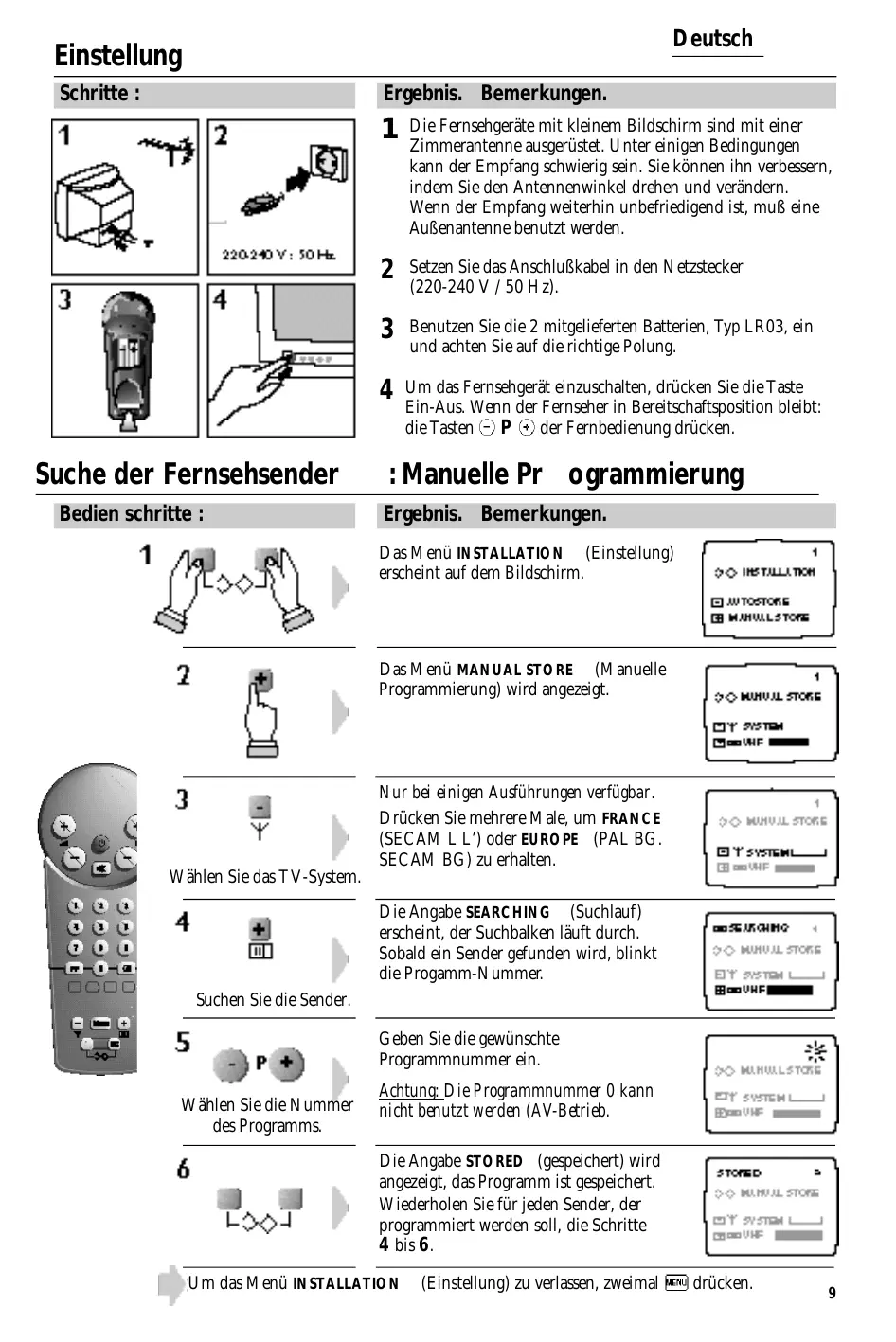 Um das Fernsehgerät einzuschalten, drücken Sie die Taste Ein-Aus. Wenn der Fernseher in Bereitschaftsposition bleibt: die Tasten P der Fernbedienung drücken. : Manuelle Pr ogrammierung Ergebnis. Bemerkungen. Das Menü INSTALLATION (Einstellung) erscheint auf dem Bildschirm. Das Menü MANUAL STORE (Manuelle Programmierung) wird angezeigt. Wählen Sie das TV-System. Nur bei einigen Ausführungen verfügbar. Drücken Sie mehrere Male, um FRANCE (SECAM L L’) oder EUROPE (PAL BG. SECAM BG) zu erhalten. Die Angabe SEARCHING (Suchlauf) erscheint, der Suchbalken läuft durch. Sobald ein Sender gefunden wird, blinkt die Progamm-Nummer. Suchen Sie die Sender. Geben Sie die gewünschte Programmnummer ein. Wählen Sie die Nummer des Programms. Achtung: Die Programmnummer 0 kann nicht benutzt werden (AV-Betrieb. Die Angabe STORED (gespeichert) wird angezeigt, das Programm ist gespeichert. Wiederholen Sie für jeden Sender, der programmiert werden soll, die Schritte 4 bis 6 . Um das Menü INSTALLATION (Einstellung) zu verlassen, zweimal drücken.