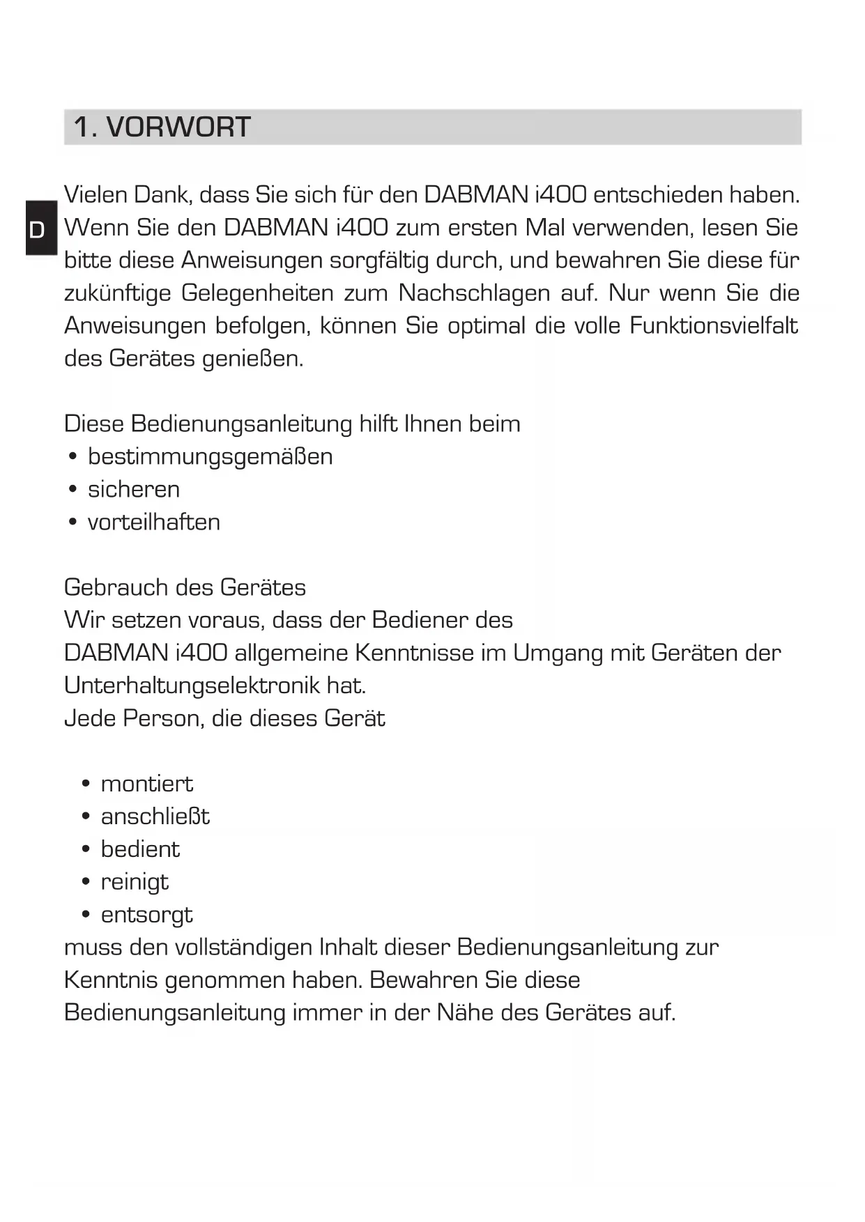 Vielen Dank, dass Sie sich für den DABMAN i400 entschieden haben. Wenn Sie den DABMAN i400 zum ersten Mal verwenden,lesen Sieitte diese Anweisungen sorgfältig durch, und bewahren Sie diese für zukünftige Gelegenheiten zum Nachschlagen auf. Nur wenn Sie die Anweisungen befolgen, können Sie optimal die volle Funktionsvielfalt des Gerätes genießen.