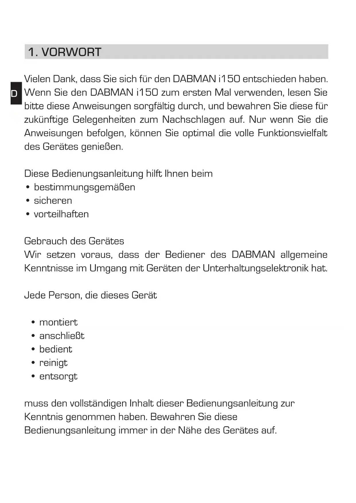 Vielen Dank, dass Sie sich für den DABMAN i150 entschieden haben. Wenn Sie den DABMAN i150 zum ersten Mal verwenden,lesen Sie bereits diese Anweisungen sorgfältig durch, und bewahren Sie diese für zukünftige Gelegenheiten zum Nachschlagen auf. Nur wenn Sie die Anweisungen befolgen, können Sie optimal die volle Funktionsvielfalt des Gerätes genießen.