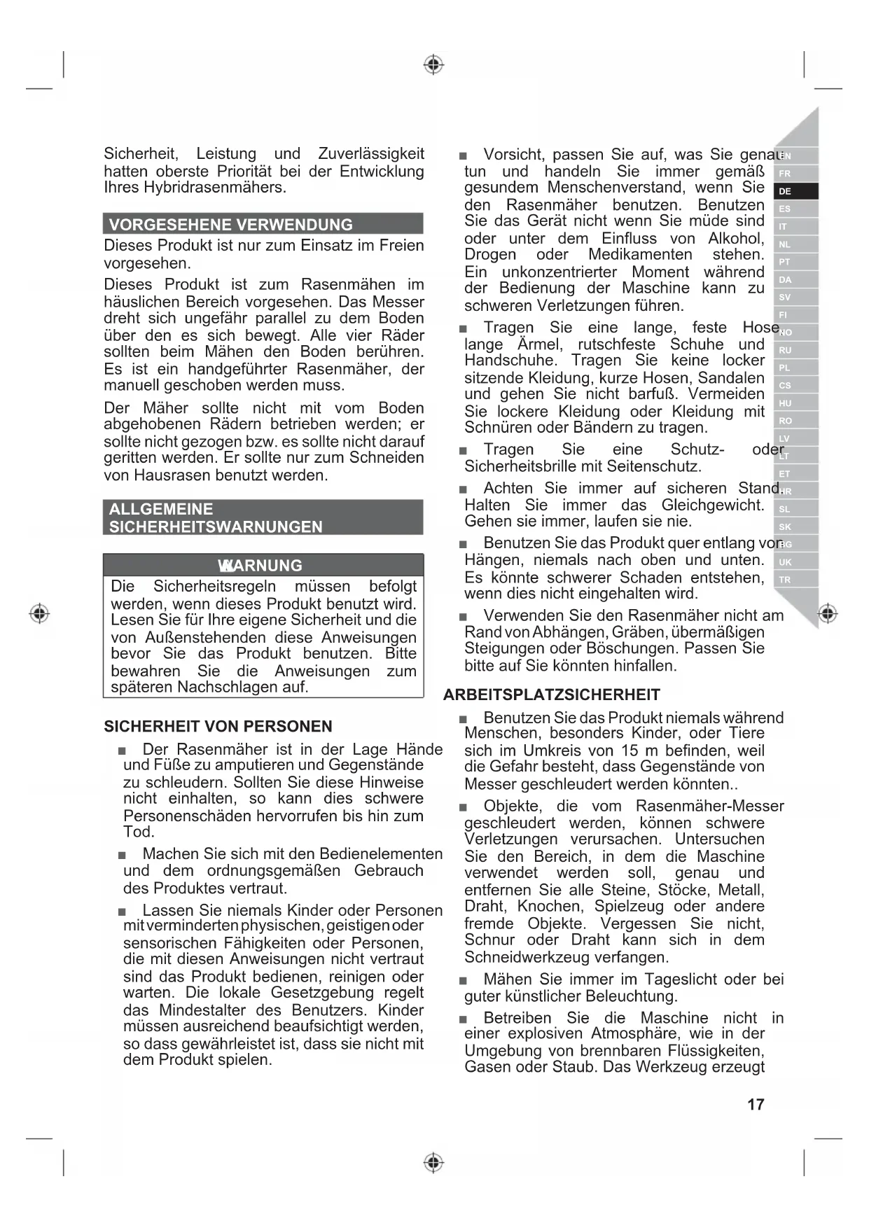 16 | FrançaisSicherheit, Leistung und Zuverlässigkeit hatten oberste Priorität bei der Entwicklung Ihres Hybridrasenmähers. VORGESEHENE VERWENDUNG Dieses Produkt ist nur zum Einsatz im Freien vorgesehen. Dieses Produkt ist zum Rasenmähen im häuslichen Bereich vorgesehen. Das Messer dreht sich ungefähr parallel zu dem Boden über den es sich bewegt. Alle vier Räder sollten beim Mähen den Boden berühren. Es ist ein handgeführter Rasenmäher, der manuell geschoben werden muss. Der Mäher sollte nicht mit vom Boden abgehobenen Rädern betrieben werden; er sollte nicht gezogen bzw. es sollte nicht darauf geritten werden. Er sollte nur zum Schneiden von Hausrasen benutzt werden. ALLGEMEINE SICHERHEITSWARNUNGEN WARNUNG Die Sicherheitsregeln müssen befolgt werden, wenn dieses Produkt benutzt wird. Lesen Sie für Ihre eigene Sicherheit und die von Außenstehenden diese Anweisungen bevor Sie das Produkt benutzen. Bitte bewahren Sie die Anweisungen zum späteren Nachschlagen auf.