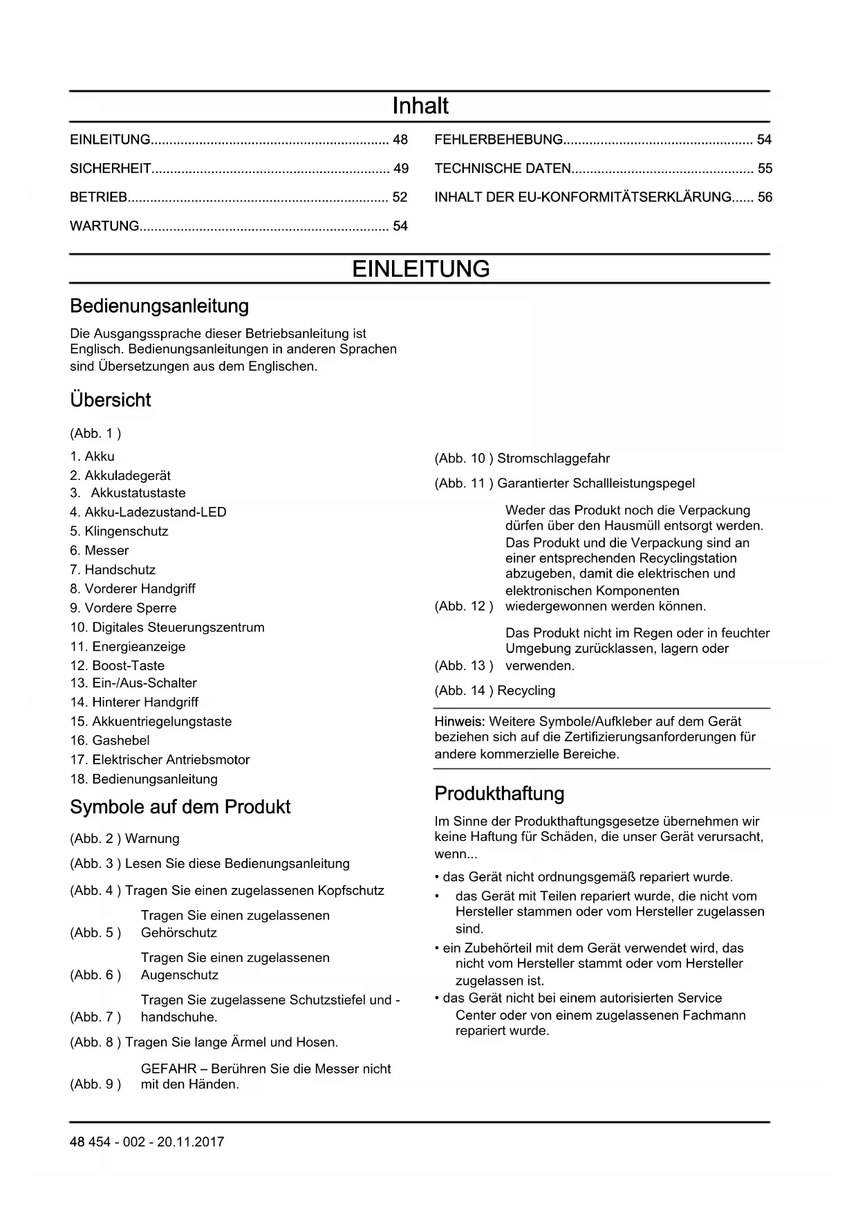 Symbole auf dem Produkt (Abb. 2 ) Warnung (Abb. 3 ) Lesen Sie diese Bedienungsanleitung (Abb. 4 ) Tragen Sie einen zugelassenen Kopfschutz (Abb. 5 ) Tragen Sie einen zugelassenen Gehörschutz (Abb. 6 ) Tragen Sie einen zugelassenen Augenschutz (Abb. 7 ) Tragen Sie zugelassene Schutzstiefel und - handschuhe. (Abb. 8 ) Tragen Sie lange Ärmel und Hosen. (Abb. 9 ) GEFAHR – Berühren Sie die Messer nicht mit den Händen. (Abb. 10 ) Stromschlaggefahr (Abb. 11 ) Garantierter Schallleistungspegel (Abb. 12 ) Weder das Produkt noch die Verpackung dürfen über den Hausmüll entsorgt werden. Das Produkt und die Verpackung sind an einer entsprechenden Recyclingstation abzugeben, damit die elektrischen und elektronischen Komponenten wiedergewonnen werden können. (Abb. 13 ) Das Produkt nicht im Regen oder in feuchter Umgebung zurücklassen, lagern oder verwenden. (Abb. 14 ) Recycling Hinweis: Weitere Symbole/Aufkleber auf dem Gerät beziehen sich auf die Zertifizierungsanforderungen für andere kommerzielle Bereiche. Produkthaftung Im Sinne der Produkthaftungsgesetze übernehmen wir keine Haftung für Schäden, die unser Gerät verursacht, wenn...