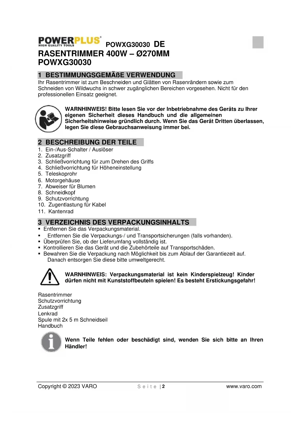 - Bewahren Sie die Verpackung nach Möglichkeit bis zum Ablauf der Garantiezeit auf. Danach entsorgen Sie diese bitte umweltgerecht. WARNHINWEIS: Verpackungsmaterial ist kein Kinderspielzeug! Kinder dürfen nicht mit Kunststoffbeuteln spielen! Es besteht Erstickungsgefahr! Rasentrimmer Schutzvorrichtung Zusatzgriff Lenkrad Spule mit 2x 5 m Schneidseil Handbuch Wenn Teile fehlen oder beschädigt sind, wenden Sie sich bitte an Ihren Händler!POWXG30030 DE Copyright © 2023 VARO S e i t e | 3 www.varo.com
