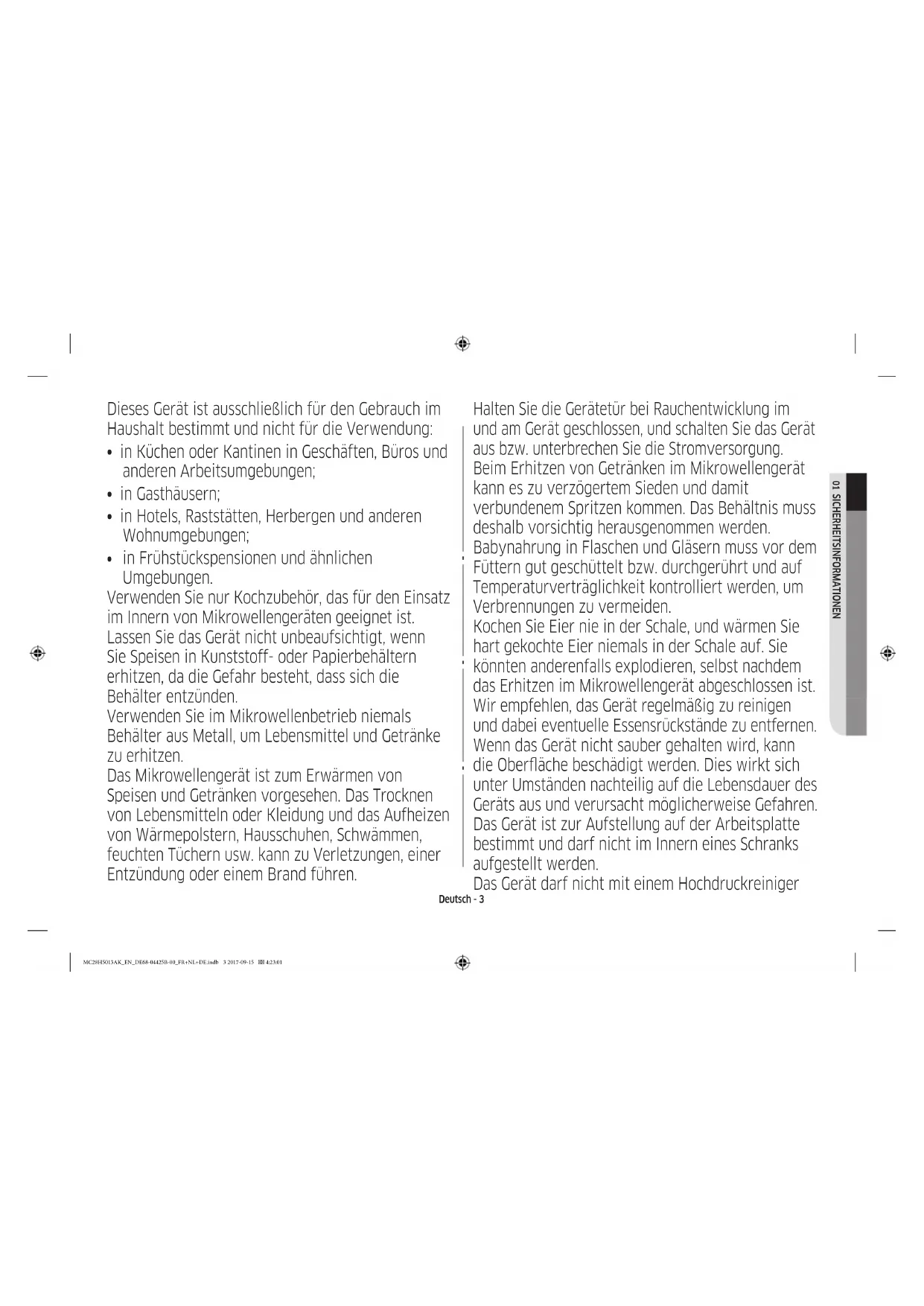 - Technische Daten MC28H5013AK_EN_DE68-04425B-00_FR+NL+DE.indb 2 2017-09-15 4:23:01Deutsch - 3 01 SICHERHEITSINFORMATIONEN Dieses Gerät ist ausschließlich für den Gebrauch im Haushalt bestimmt und nicht für die Verwendung: p. 43