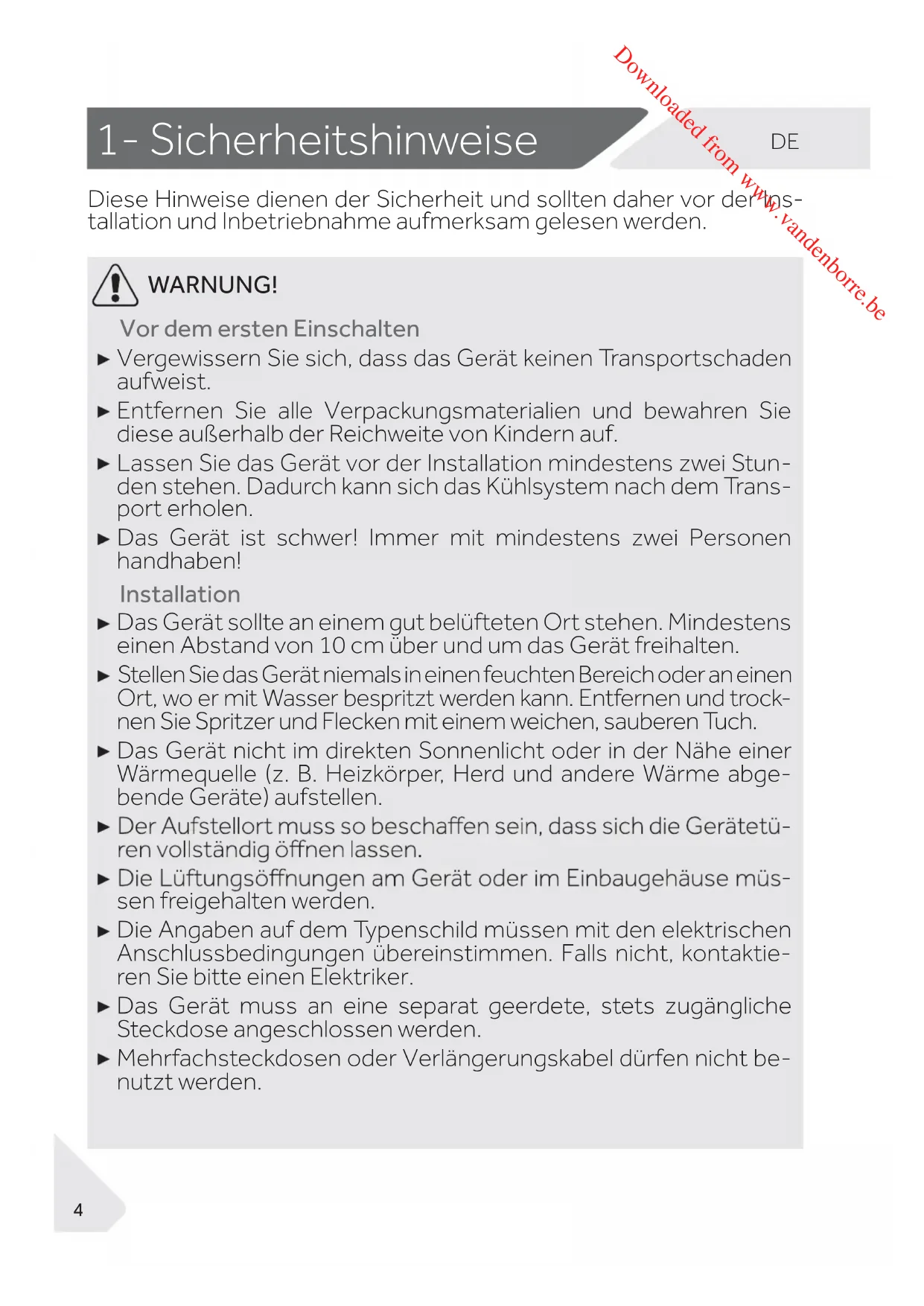 Downloaded from www.vandenborre.beDE WARNUNG! Das Gerät niemals horizontal auf den Boden legen.