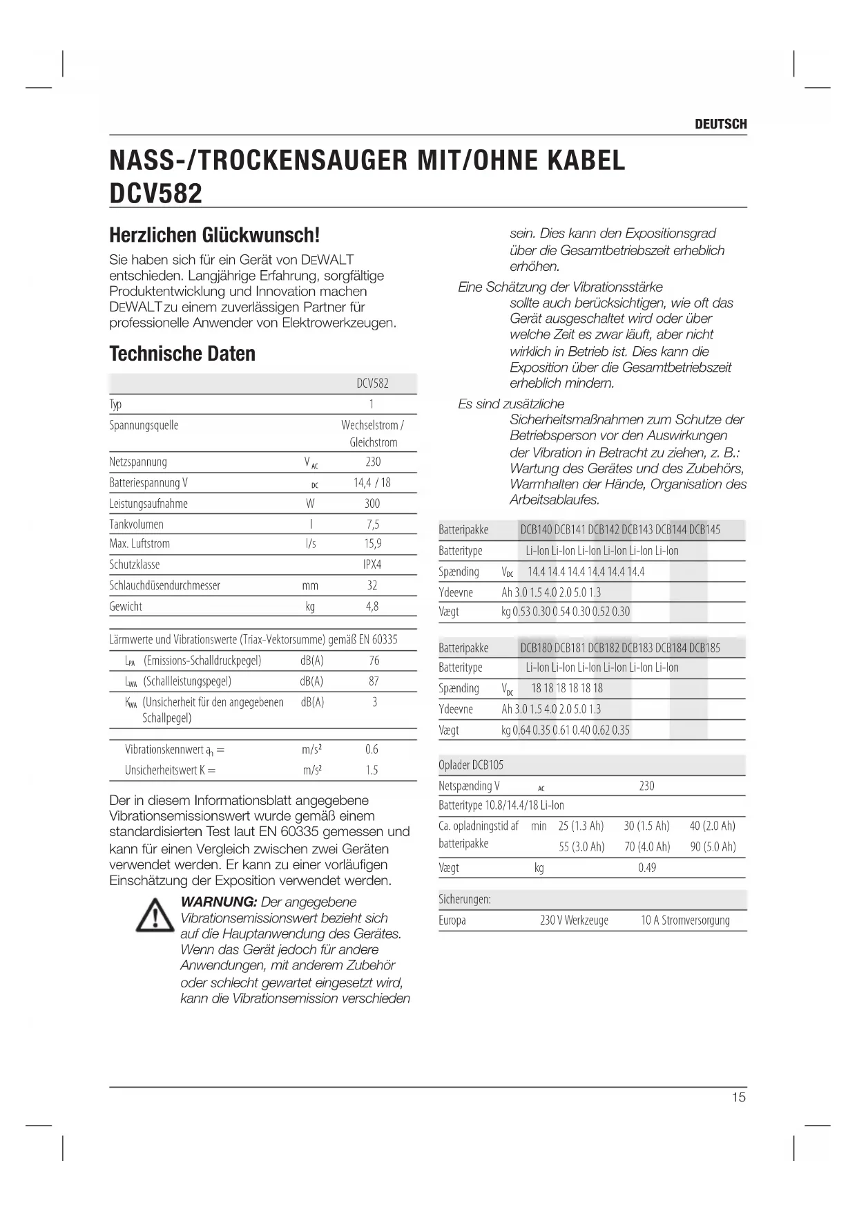 entschieden. Langjährige Erfahrung, sorgfältige Produktentwicklung und Innovation machen DeWALT zu einem zuverlässigen Partner für professionelle Anwender von Elektrowerkzeugen. Technische Daten DCV582 Typ 1 Spannungsquelle Wechselstrom / Gleichstrom Netzspannung V