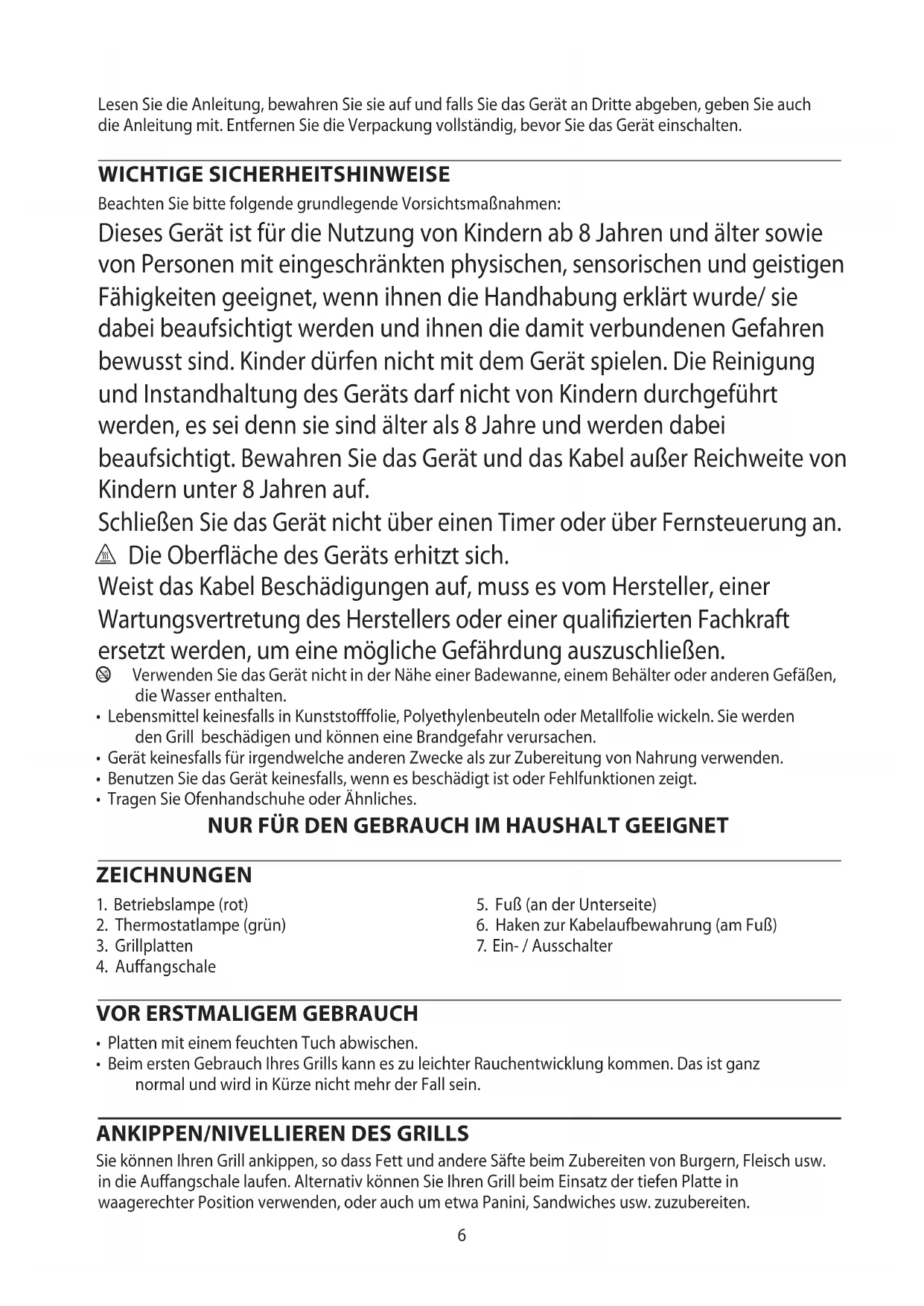 AE6 Lesen Sie die Anleitung, bewahren Sie sie auf und falls Sie das Gerät an Dritte abgeben, geben Sie auch die Anleitung mit. Entfernen Sie die Verpackung vollständig, bevor Sie das Gerät einschalten. WICHTIGE SICHERHEITSHINWEISE Beachten Sie bitte folgende grundlegende Vorsichtsmaßnahmen: Dieses Gerät ist für die Nutzung von Kindern ab 8 Jahren und älter sowie von Personen mit eingeschränkten physischen, sensorischen und geistigen Fähigkeiten geeignet, wenn ihnen die Handhabung erklärt wurde/ sie dabei beaufsichtigt werden und ihnen die damit verbundenen Gefahren bewusst sind. Kinder dürfen nicht mit dem Gerät spielen. Die Reinigung und Instandhaltung des Geräts darf nicht von Kindern durchgeführt werden, es sei denn sie sind älter als 8 Jahre und werden dabei beaufsichtigt. Bewahren Sie das Gerät und das Kabel außer Reichweite von Kindern unter 8 Jahren auf. Schließen Sie das Gerät nicht über einen Timer oder über Fernsteuerung an. ¬ Die Oberäche des Geräts erhitzt sich. Weist das Kabel Beschädigungen auf, muss es vom Hersteller, einer Wartungsvertretung des Herstellers oder einer qualizierten Fachkraft ersetzt werden, um eine mögliche Gefährdung auszuschließen. b Verwenden Sie das Gerät nicht in der Nähe einer Badewanne, einem Behälter oder anderen Gefäßen, die Wasser enthalten.