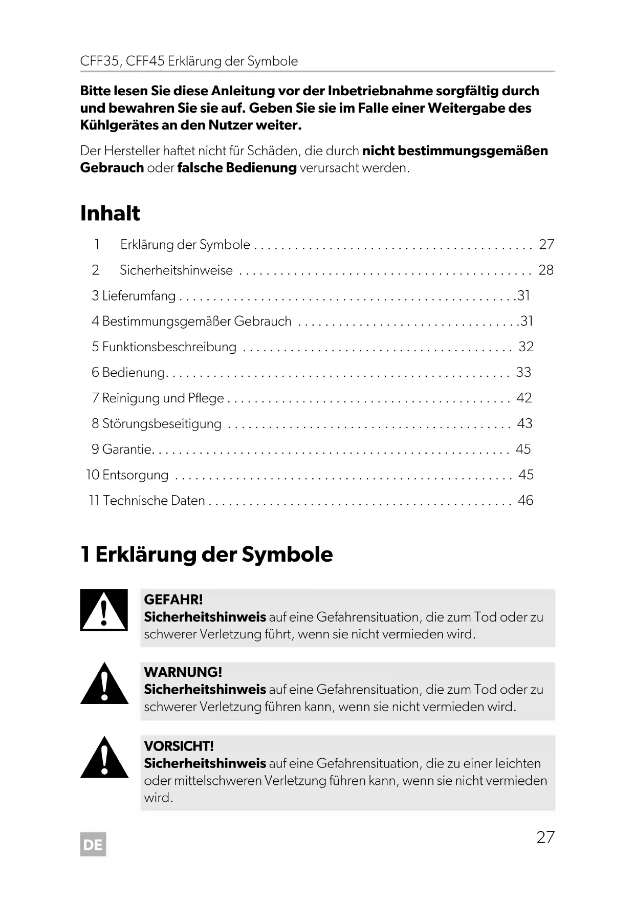 - Bitte lesen Sie diese Anleitung vor der Inbetriebnahme sorgfältig durch und bewahren Sie sie auf. Geben Sie sie im Falle einer Weitergabe des Kühlgerätes an den Nutzer weiter. Der Hersteller haftet nicht für Schäden, die durch nicht bestimmungsgemäßen Gebrauch oder falsche Bedienung verursacht werden. Inhalt 1 Erklärung der Symbole p. 27