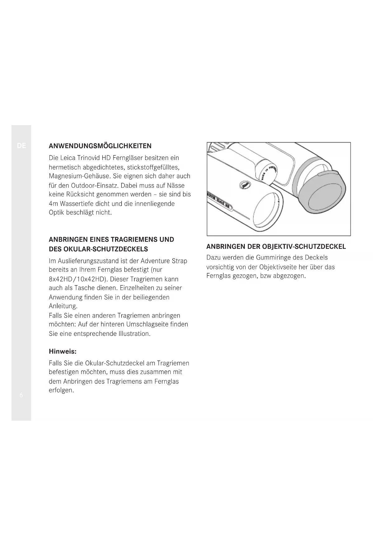 VORWORT Sehr geehrte Kundin, sehr geehrter Kunde, Der Name Leica steht weltweit für höchste Qualität, feinmechanische Präzision bei äußerster Zuverlässigkeit und langer Lebensdauer. Wir wünschen Ihnen viel Freude und Erfolg mit Ihrem neuen Leica Trinovid HD Fernglas. Damit Sie es richtig einsetzen können, empfehlen wir Ihnen, zunächst diese Anleitung zu lesen. LIEFERUMFANG – Fernglas – Adventure Strap (nur 8x42HD/10x42HD) – Tragriemen – Optik Reinigungstuch – Okularschutzdeckel – 2 Objektiv-Schutzdeckel – Anleitung – Garantiekarte – Prüfzertifikat