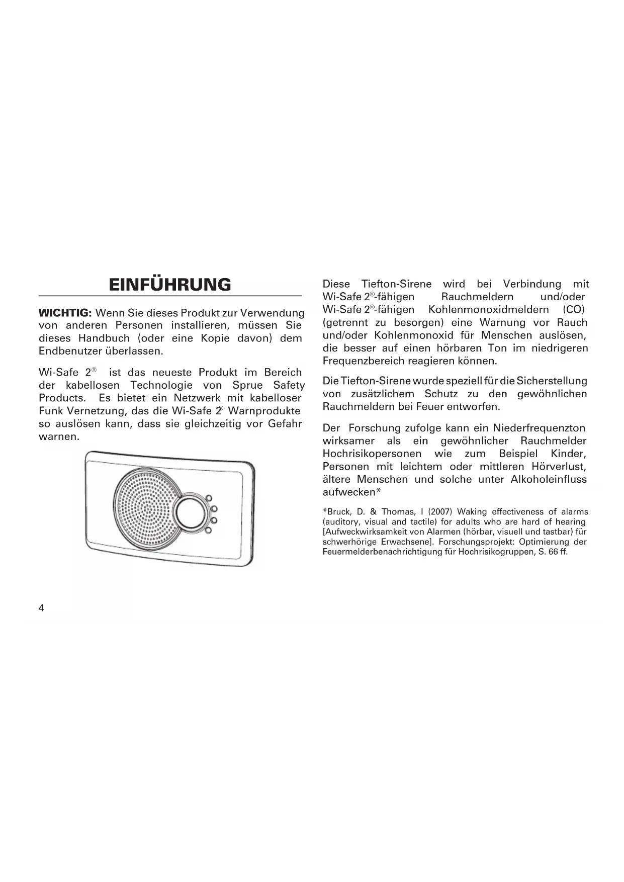 Produktreihe wird zurzeit erweitert. Bitte besuchen Sie www.fireangel.eu für weitere Einzelheiten über die neuesten Erweiterungen des Portfolios. INSTALLATION DER TIEFTON-SIRENE VORBEREITUNGEN: Stellen Sie bitte sicher, das gesamte Handbuch vor der Installation Ihrer Tiefton- Sirene gelesen und verstanden zu haben. Ihre Tiefton-Sirene ist zur Verwendung in Verbindung mit Rauch- und Kohlenmonoxidmeldern aus der Produktreihe Wi-Safe 2