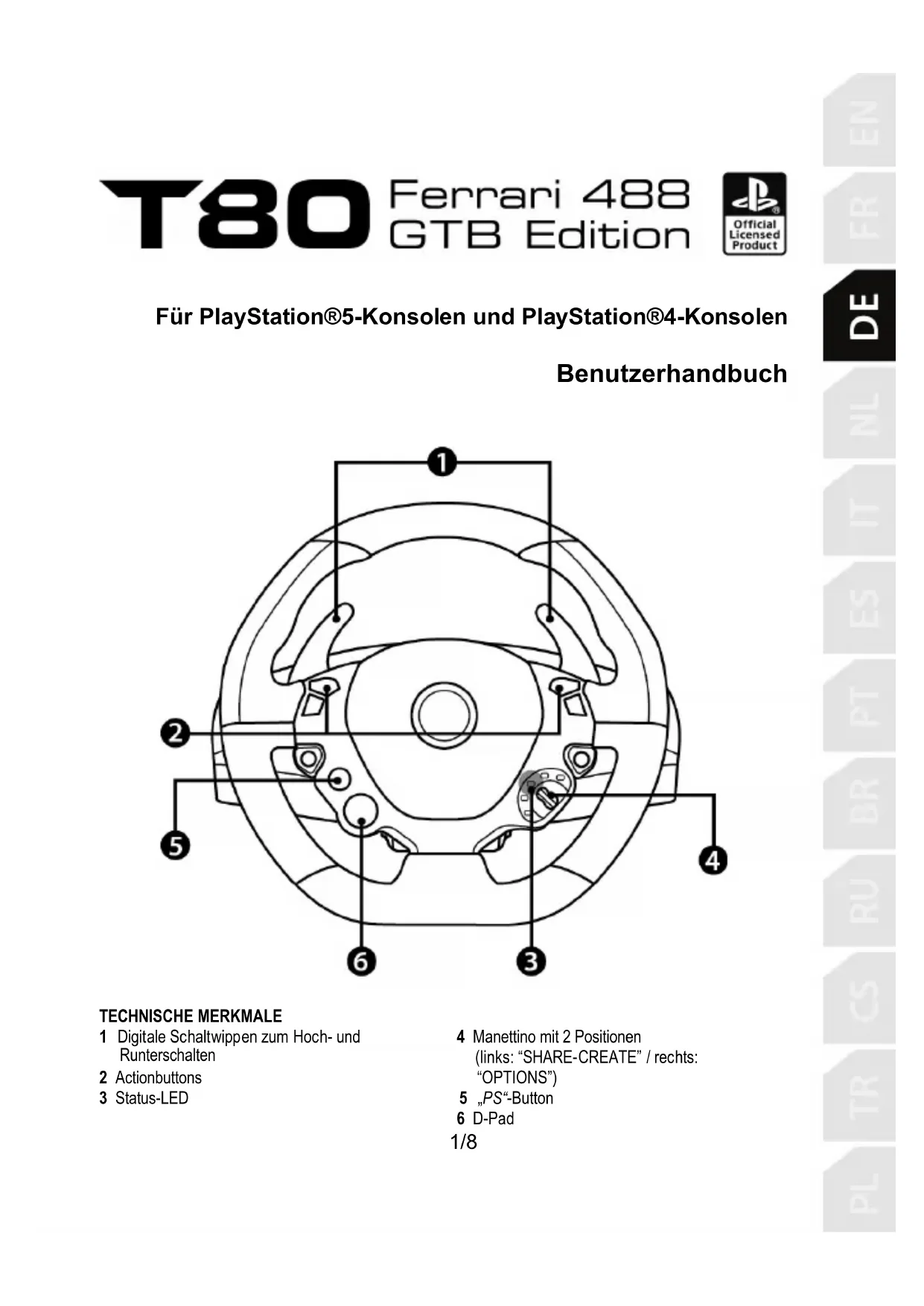 WICHTIGER HINWEIS ZUR PS5™-KONSOLE ODER PS4™-KONSOLE Vergessen Sie auf keinen Fall den „PS“-Button (5) zu drücken, um das Lenkrad nutzen zu können.5/8 AUTOMATISCHE EMULATION DES LENKRADS AUF ALLEN PS5™-KONSOLEN ODER PS4™-KONSOLEN In Spielen für PlayStation®5-Konsolen und PlayStation®4-Konsolen wird das Rennlenkrad T80 als reales Lenkrad und nicht als Controller erkannt, was eine bessere Reaktionsfähigkeit und höhere Präzision zur Folge hat. - Um das Mapping (die Belegung) zu verändern, gehen Sie in das „OPTIONS“-Menü Ihres Spiels und wählen dann WHEEL SETTINGS (Lenkrad-Einstellungen). - Um die Steuer-Empfindlichkeit Ihres Lenkrads zu verändern, gehen Sie in das „OPTIONS“-Menü Ihres Spiels und wählen dann WHEEL SETTINGS (Lenkrad-Einstellungen). LISTE DER SPIELE FÜR PLAYSTATION®5-KONSOLEN UND PLAYSTATION®4-KONSOLEN Eine Liste der Spiele für PS5™-Konsolen und PS4™-Konsolen, die mit dem Lenkrad kompatibel sind, finden Sie unter https://support.thrustmaster.com. Diese Liste wird regelmäßig ergänzt. EINRICHTEN DES RENNLENKRADS FÜR DEN PC*