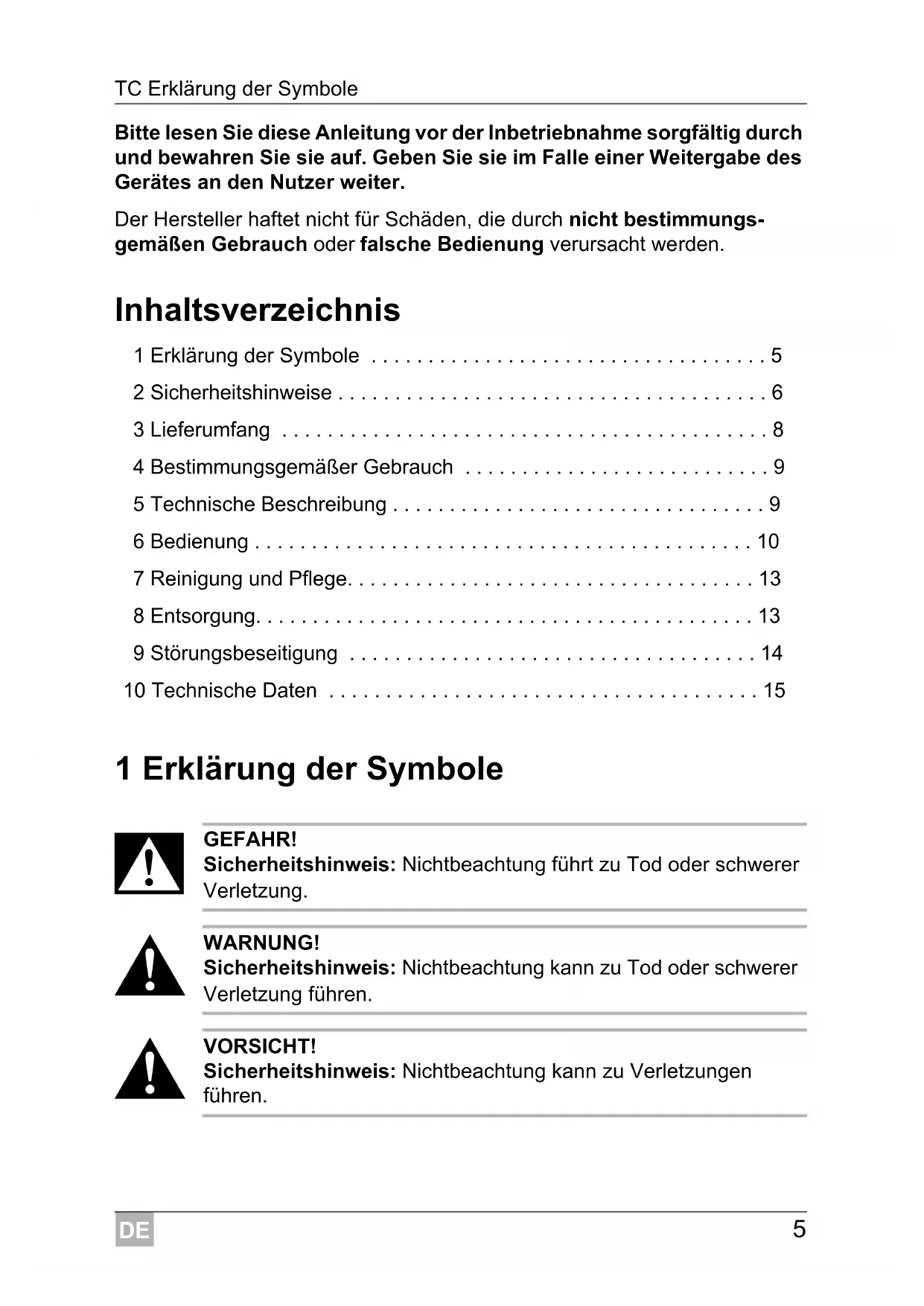- Bitte lesen Sie diese Anleitung vor der Inbetriebnahme sorgfältig durch und bewahren Sie sie auf. Geben Sie sie im Falle einer Weitergabe des Gerätes an den Nutzer weiter. Der Hersteller haftet nicht für Schäden, die durch nicht bestimmungs- gemäßen Gebrauch oder falsche Bedienung verursacht werden. Inhaltsverzeichnis 1 Erklärung der Symbole p. 5