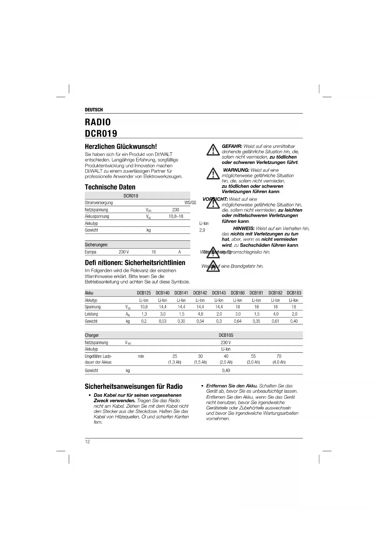 - Produktet returneres komplet med alle originale komponenter; Hvis du ønsker at reklamere, kontakt din forhandler eller find adressen på12 DEUTSCH RADIO DCR019 GEFAHR: Weist auf eine unmittelbar drohende gefährliche Situation hin, die, sofern nicht vermieden, zu tödlichen oder schweren Verletzungen führt. WARNUNG: Weist auf eine möglicherweise gefährliche Situation hin, die, sofern nicht vermieden, zu tödlichen oder schweren Verletzungen führen kann. VORSICHT: Weist auf eine möglicherweise gefährliche Situation hin, die, sofern nicht vermieden, zu leichten oder mittelschweren Verletzungen führen kann. HINWEIS: Weist auf ein Verhalten hin, das nichts mit Verletzungen zu tun hat, aber, wenn es nicht vermieden wird, zu Sachschäden führen kann. Weist auf ein Stromschlagrisiko hin. Weist auf eine Brandgefahr hin. Herzlichen Glückwunsch! Sie haben sich für ein Produkt von DEWALT entschieden. Langjährige Erfahrung, sorgfältige Produktentwicklung und Innovation machen