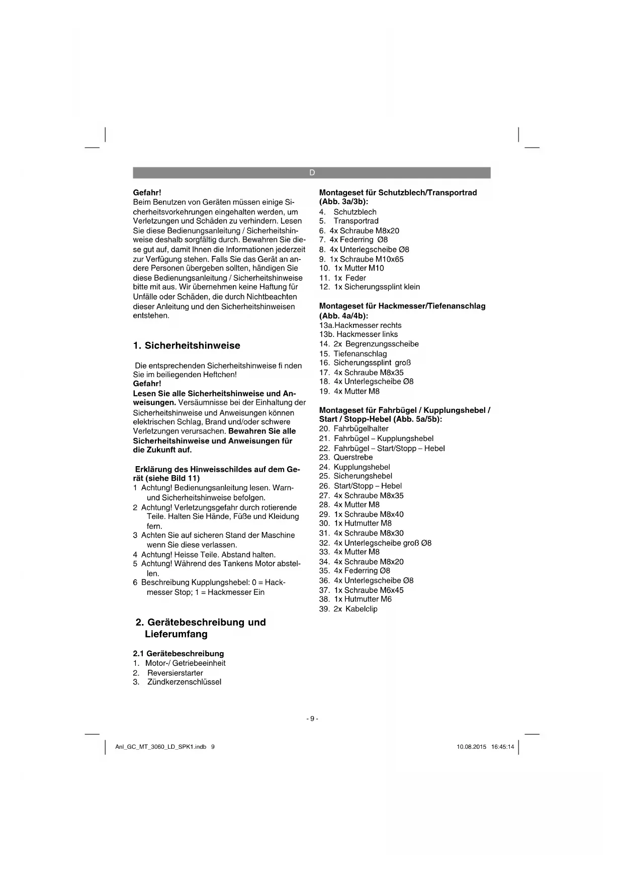 Pos. 2) starten. Hierfür den Griff ca. 10-15 cm (bis ein Widerstand spürbar ist) herauszie- hen, dann kräftig mit einem Ruck anziehen. Sollte der Motor nicht gestartet haben, noch- mals am Griff anziehen. Hinweis! Den Seilzug nicht zurückschleudern lassen. Hinweis! Bei kühlem Wetter kann es erforderlich sein, den Anlassvorgang mehrmals zu wieder- holen. Motor Stoppen Stellen Sie den Motor Start/Stopp - Hebel (26) in Position STOP. Anl_GC_MT_3060_LD_SPK1.indb 11Anl_GC_MT_3060_LD_SPK1.indb 11 10.08.2015 16:45:1410.08.2015 16:45:14D
