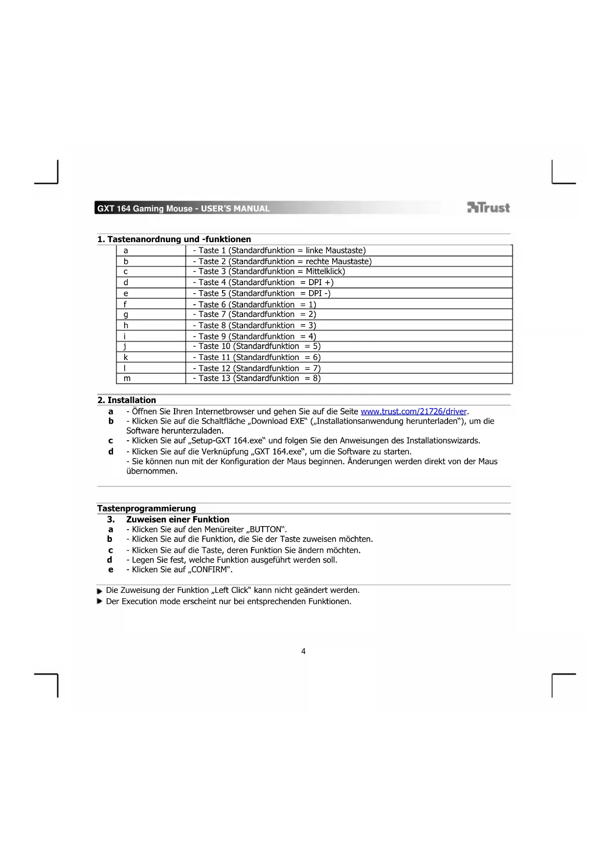 - Öffnen Sie Ihren Internetbrowser und gehen Sie auf die Seite www.trust.com/21726/driver. - Klicken Sie auf die Schaltfläche „Download EXE“ („Installationsanwendung herunterladen“), um die Software herunterzuladen. - Klicken Sie auf „Setup-GXT 164.exe“ und folgen Sie den Anweisungen des Installationswizards. - Klicken Sie auf die Verknüpfung „GXT 164.exe“, um die Software zu starten. - Sie können nun mit der Konfiguration der Maus beginnen. Änderungen werden direkt von der Maus übernommen.