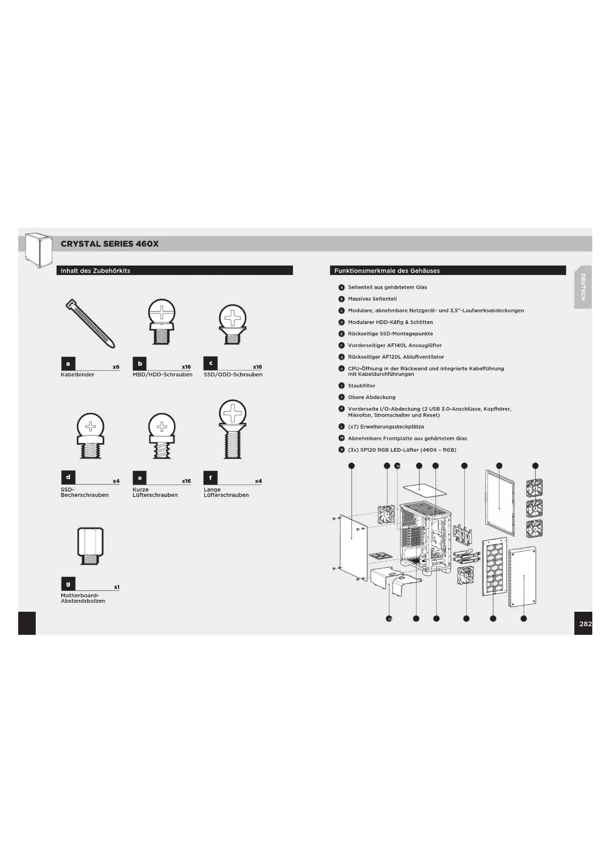 DEUTSCH Funktionsmerkmale des Gehäuses Inhalt des Zubehörkits Seitenteil aus gehärtetem Glas Massives Seitenteil Modulare, abnehmbare Netzgerät- und 3,5”-Laufwerksabdeckungen Modularer HDD-Käfig & Schlitten Rückseitige SSD-Montagepunkte Vorderseitiger AF140L Ansauglüfter Rückseitiger AF120L Abluftventilator CPU-Önung in der Rückwand und integrierte Kabelführung mit Kabeldurchführungen Staubfilter Obere Abdeckung Vorderseite I/O-Abdeckung (2 USB 3.0-Anschlüsse, Kopfhörer, Mikrofon, Stromschalter und Reset) (x7) Erweiterungssteckplätze Abnehmbare Frontplatte aus gehärtetem Glas (3x) SP120 RGB LED-Lüfter (460X – RGB)