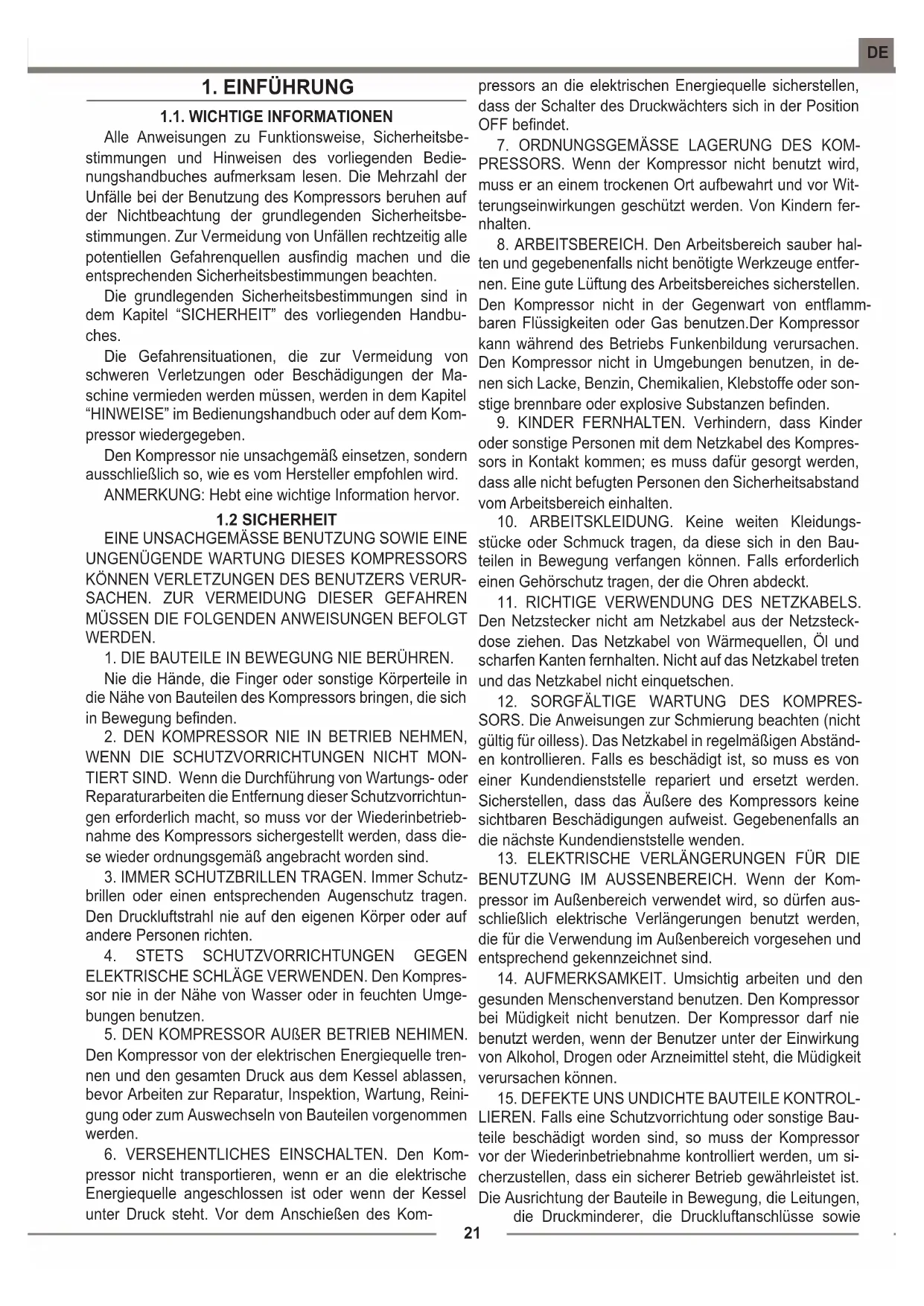 Beim Betrieb des Kompressors sämtliche Anweisungen des vorliegenden Handbuches beachten. Verhindern dass der Kompressor von Kindern oder von Personen benutzt wird, die mit seiner Funktionsweise nicht vertraut sind.