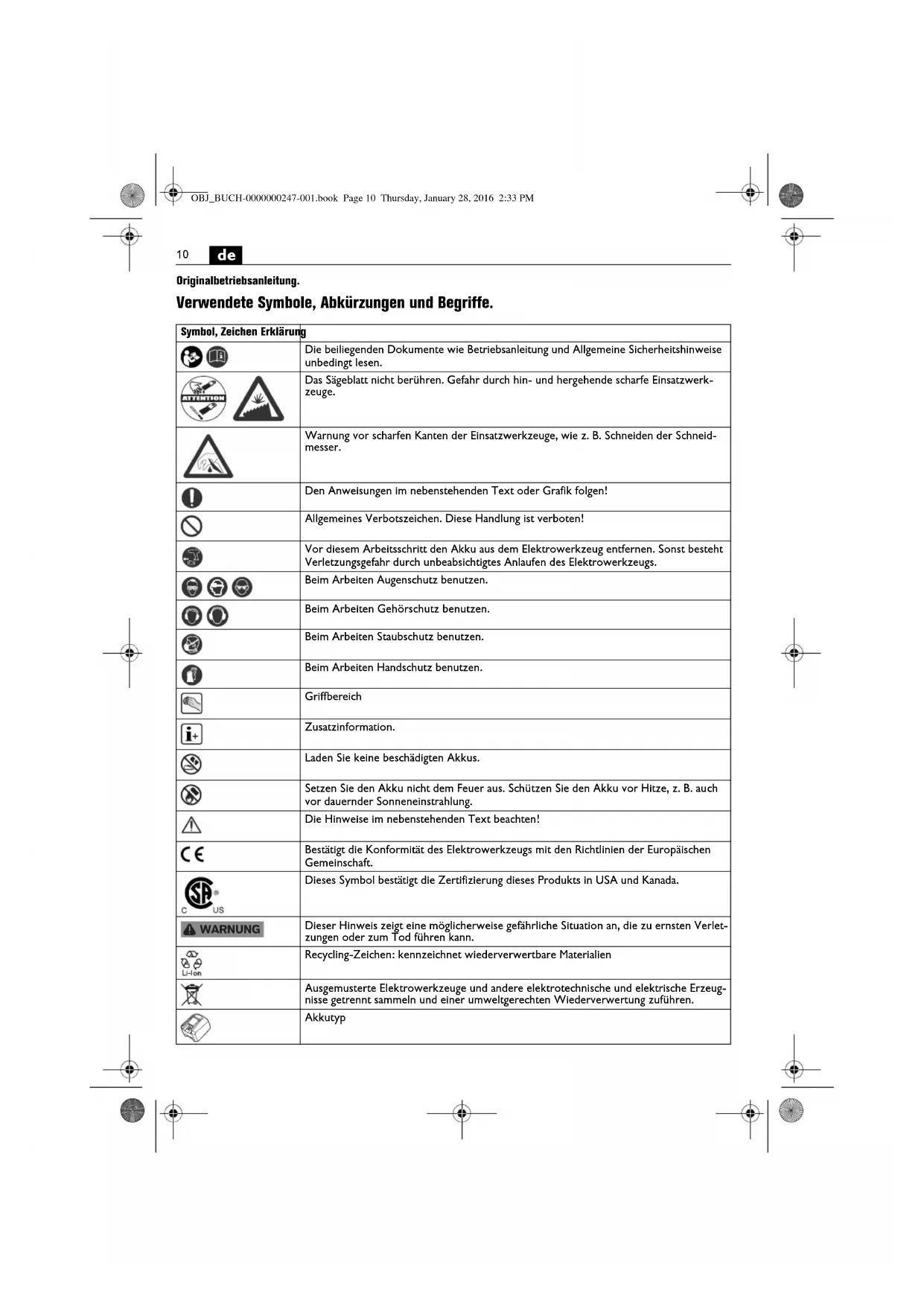 Originalbetriebsanleitung. Verwendete Symbole, Abkürzungen und Begriffe. Symbol, Zeichen Erklärung Die beiliegenden Dokumente wie Betriebsanleitung und Allgemeine Sicherheitshinweise unbedingt lesen. Das Sägeblatt nicht berühren. Gefahr durch hin- und hergehende scharfe Einsatzwerk- zeuge. Warnung vor scharfen Kanten der Einsatzwerkzeuge, wie z. B. Schneiden der Schneid- messer. Den Anweisungen im nebenstehenden Text oder Grafik folgen! Allgemeines Verbotszeichen. Diese Handlung ist verboten! Vor diesem Arbeitsschritt den Akku aus dem Elektrowerkzeug entfernen. Sonst besteht Verletzungsgefahr durch unbeabsichtigtes Anlaufen des Elektrowerkzeugs. Beim Arbeiten Augenschutz benutzen. Beim Arbeiten Gehörschutz benutzen. Beim Arbeiten Staubschutz benutzen. Beim Arbeiten Handschutz benutzen. Griffbereich Zusatzinformation. Laden Sie keine beschädigten Akkus. Setzen Sie den Akku nicht dem Feuer aus. Schützen Sie den Akku vor Hitze, z. B. auch vor dauernder Sonneneinstrahlung. Die Hinweise im nebenstehenden Text beachten! Bestätigt die Konformität des Elektrowerkzeugs mit den Richtlinien der Europäischen Gemeinschaft. Dieses Symbol bestätigt die Zertifizierung dieses Produkts in USA und Kanada. Dieser Hinweis zeigt eine möglicherweise gefährliche Situation an, die zu ernsten Verlet- zungen oder zum Tod führen kann. Recycling-Zeichen: kennzeichnet wiederverwertbare Materialien Ausgemusterte Elektrowerkzeuge und andere elektrotechnische und elektrische Erzeug- nisse getrennt sammeln und einer umweltgerechten Wiederverwertung zuführen. Akkutyp WARNUNG OBJ_BUCH-0000000247-001.book Page 10 Thursday, January 28, 2016 2:33 PM11