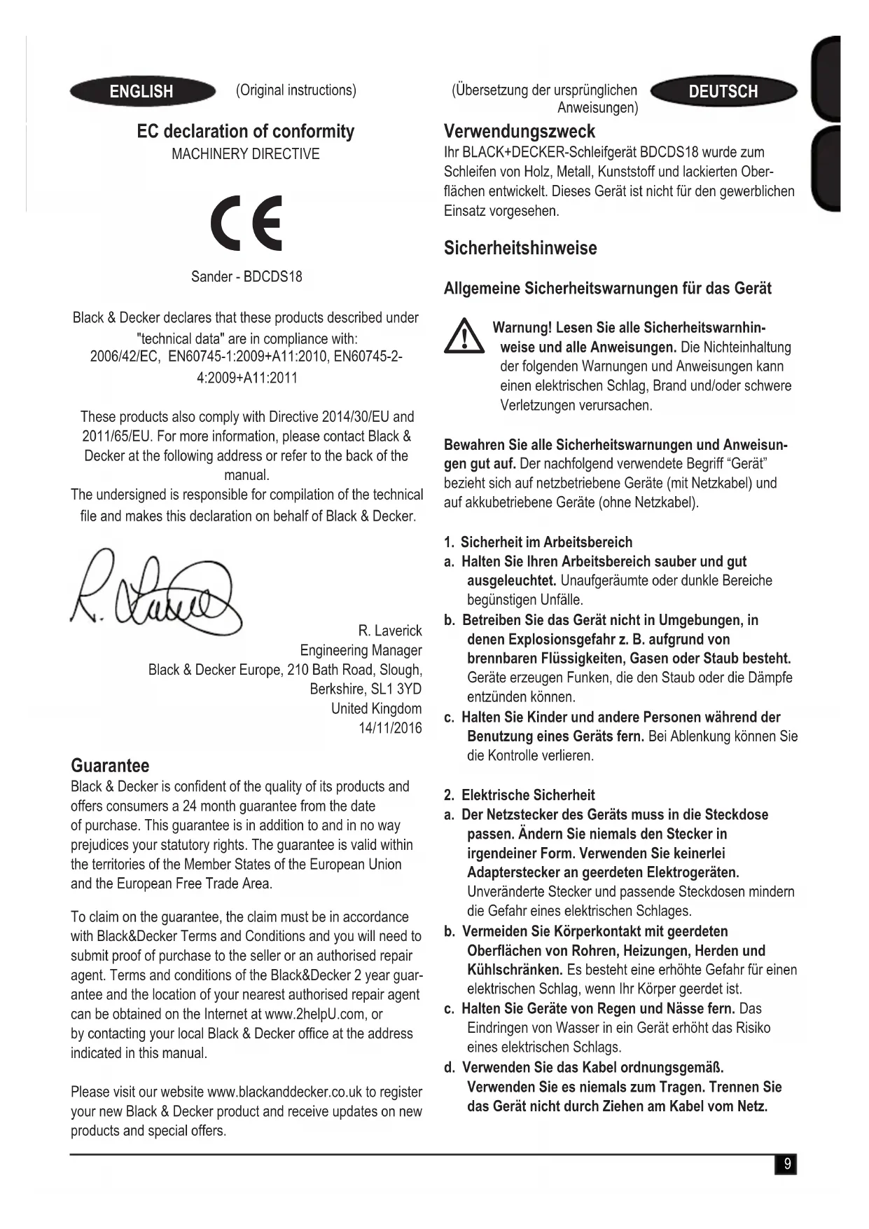 Schleifgerät - BDCDS18 Black & Decker erklärt, dass die unter „Technische Daten“ beschriebenen Geräte übereinstimmen mit: 2006/42/EC, EN60745-1:2009+A11:2010, EN60745-2- 4:2009+A11:2011 Diese Produkte entsprechen außerdem den Richtlinien 2014/30/EU und 2011/65/EU. Weitere Informationen erhalten Sie von Black & Decker unter der folgenden Adresse. Diese bendet sich auch auf der Rückseite dieser Anleitung. Der Unterzeichnete ist verantwortlich für die Zusammen- stellung der technischen Daten und gibt diese Erklärung im Namen von Black & Decker ab. R. Laverick Engineering Manager Black & Decker Europe, 210 Bath Road, Slough, Berkshire, SL1 3YD Vereinigtes Königreich