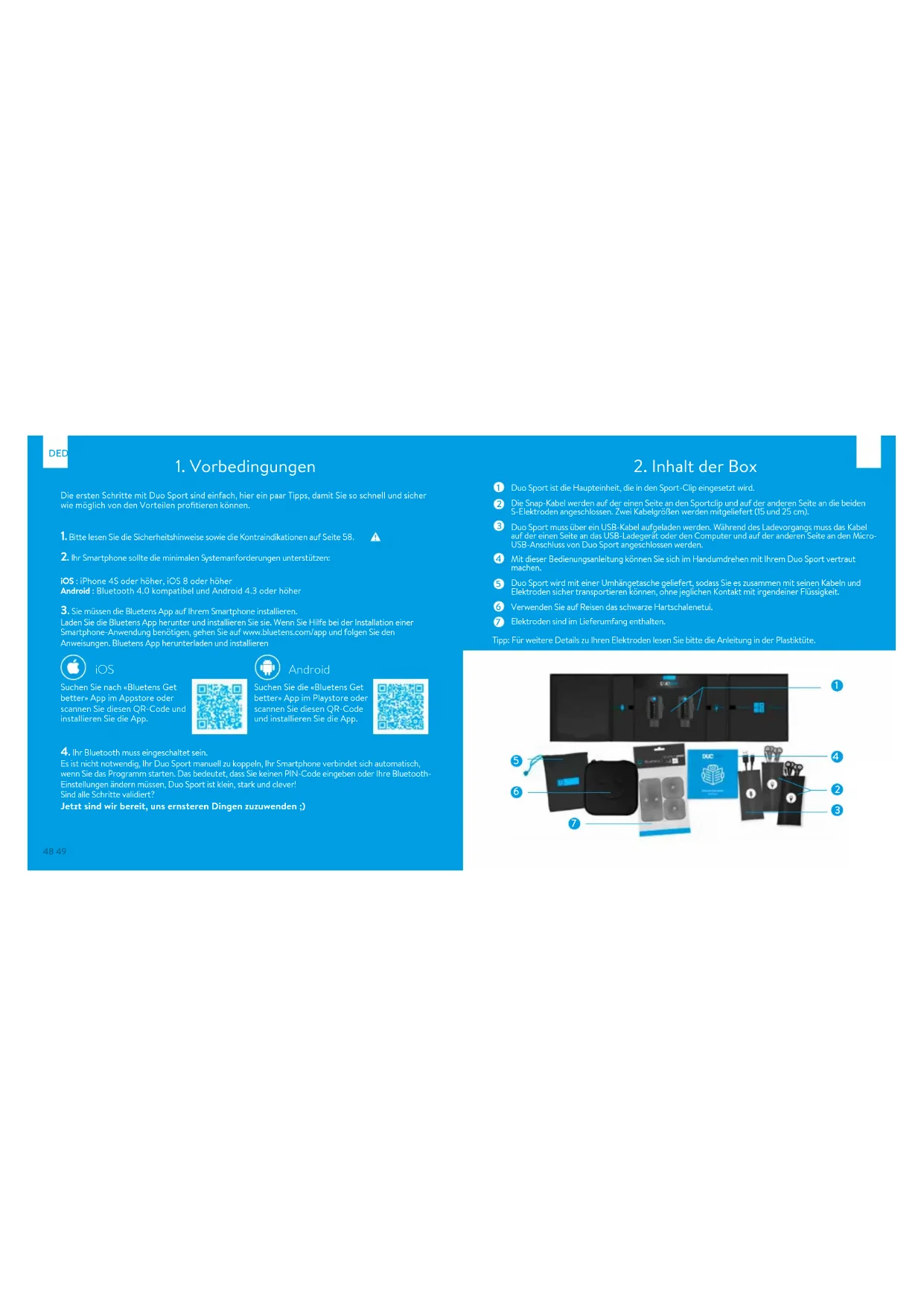 Vorbedingungen Inhalt der Box Das Duo Sport Die Anwendung Erstmalige Benutzung Sicherheitshinweise Technische Daten Kundenbetreuung Garantie Wir danken Ihnen für den Kauf eines Duo Sport- Gerätes. Duo Sport ist ein medizinisches Gerät. Um es optimal nutzen zu können, finden Sie alle relevanten Informationen in dieser Bedienungsanleitung. Für weitere Informationen oder um uns einfach nur Ihr Feedback zu geben, können Sie uns unter contact@bluetens.com kontaktieren. Danke!