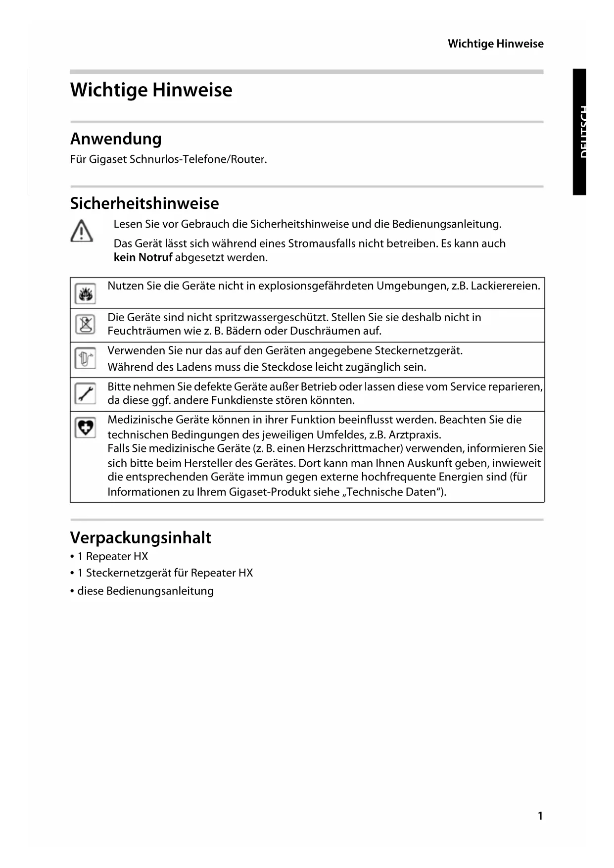 - diese Bedienungsanleitung Lesen Sie vor Gebrauch die Sicherheitshinweise und die Bedienungsanleitung. Das Gerät lässt sich während eines Stromausfalls nicht betreiben. Es kann auch kein Notruf abgesetzt werden. Nutzen Sie die Geräte nicht in explosionsgefährdeten Umgebungen, z.B. Lackierereien. Die Geräte sind nicht spritzwassergeschützt. Stellen Sie sie deshalb nicht in Feuchträumen wie z. B. Bädern oder Duschräumen auf. Verwenden Sie nur das auf den Geräten angegebene Steckernetzgerät. Während des Ladens muss die Steckdose leicht zugänglich sein. Bitte nehmen Sie defekte Geräte außer Betrieb oder lassen diese vom Service reparieren, da diese ggf. andere Funkdienste stören könnten. Medizinische Geräte können in ihrer Funktion beeinflusst werden. Beachten Sie die technischen Bedingungen des jeweiligen Umfeldes, z.B. Arztpraxis. Falls Sie medizinische Geräte (z. B. einen Herzschrittmacher) verwenden, informieren Sie sich bitte beim Hersteller des Gerätes. Dort kann man Ihnen Auskunft geben, inwieweit die entsprechenden Geräte immun gegen externe hochfrequente Energien sind (für Informationen zu Ihrem Gigaset-Produkt siehe „Technische Daten“).2 Template Go, Version 1, 01.07.2014 / ModuleVersion 1.0 Einleitung Repeater HX / BA IM de / A31008-N603-R101-1-SU19 / Grep-ger_HX.fm / 3/28/19 Einleitung Mit dem Gigaset Repeater können Sie die Reichweite Ihres DECT-Telefons vergrößern. Bis zu 6 Gigaset Repeater können an einer Basis gleichzeitig genutzt werden. Die max. Anzahl ist abhängig von Ihrer Basis und der Art der DECT-Übertragung (verschlüsselt/unverschlüsselt). Im Repeater-Bereich können gleichzeitig max. 2 Gespräche geführt werden. Die Anzahl der anmeldbaren Mobilteile an Ihrer Basis wird durch den Gigaset Repeater nicht beeinflusst. Leistungsmerkmale des Repeater HX: