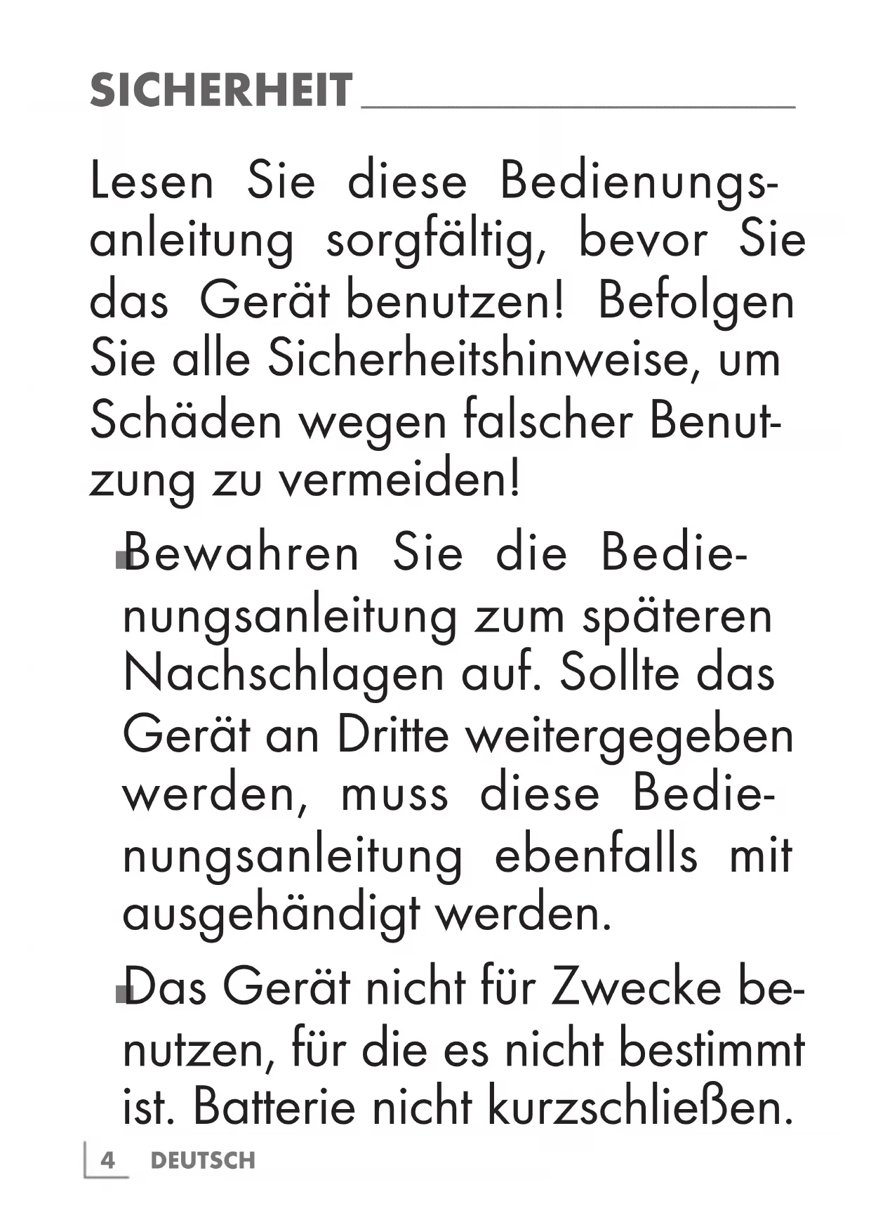 Das Gerät nicht für Zwecke be- nutzen, für die es nicht bestimmt ist. Batterie nicht kurzschließen.5 DEUTSCH