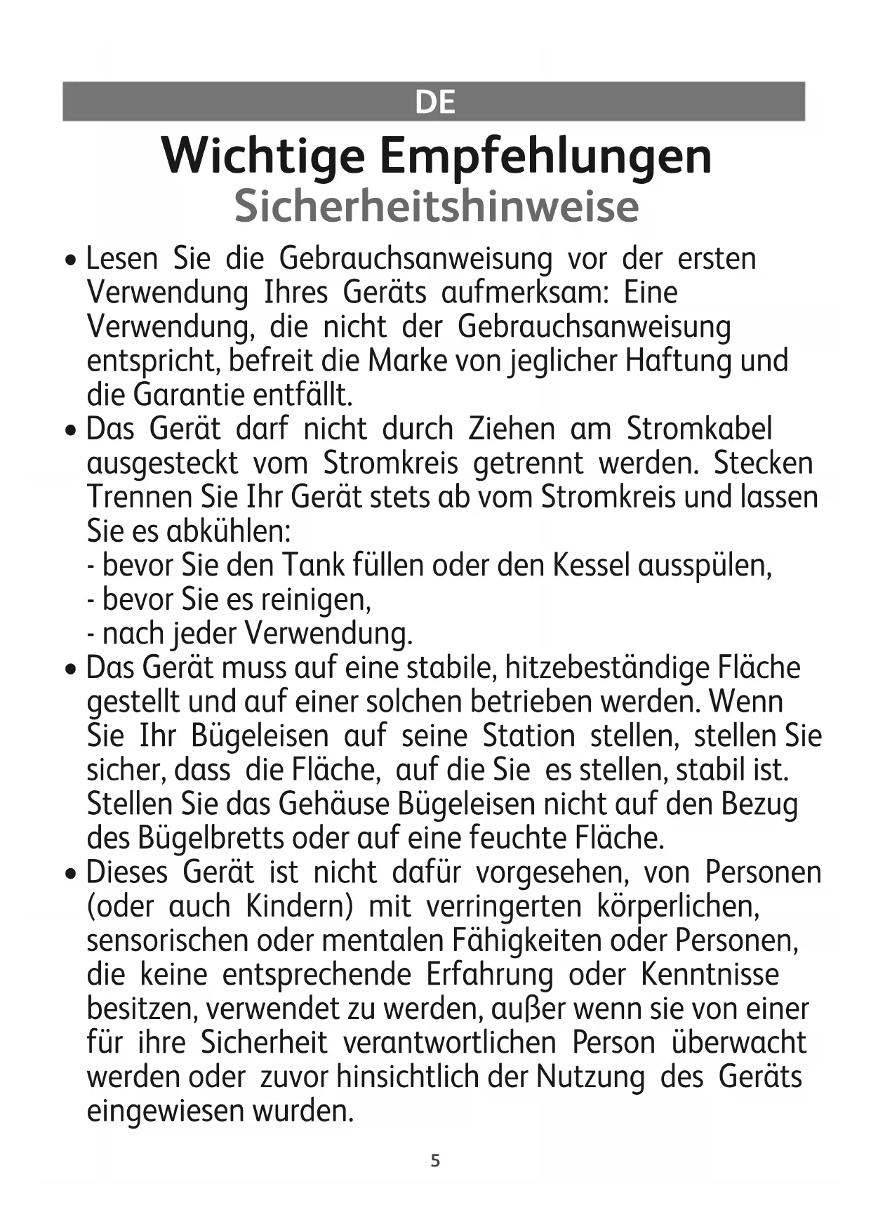 - Ihr Gerät erzeugt Dampf, der Verbrennungen verursachen kann. Gehen Sie vorsichtig mit dem Bügeleisen um, vor allem beim vertikalen Bügeln Dampfen. Richten Sie den Dampf niemals gegen Personen oder Tiere.