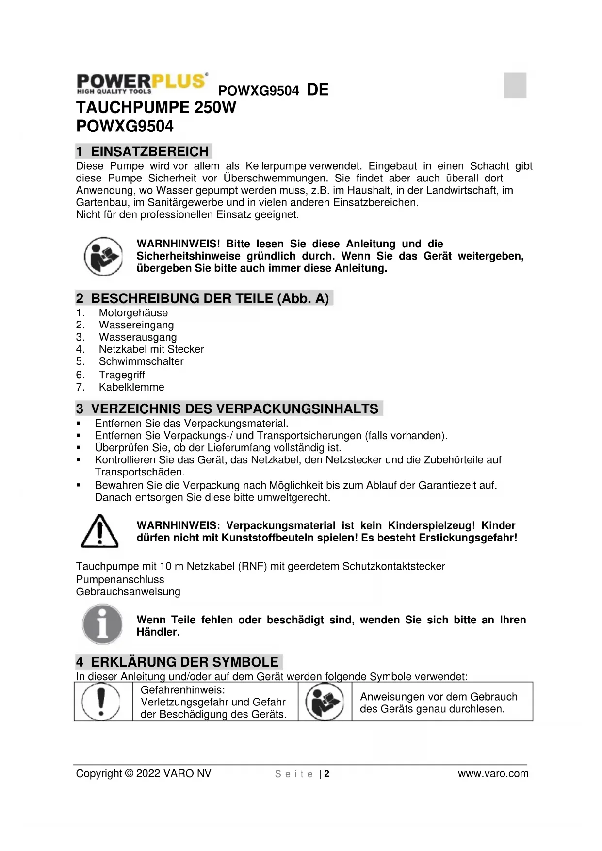 Anweisungen vor dem Gebrauch des Geräts genau durchlesen.POWXG9504 DE Copyright © 2022 VARO NV S e i t e | 3 www.varo.com