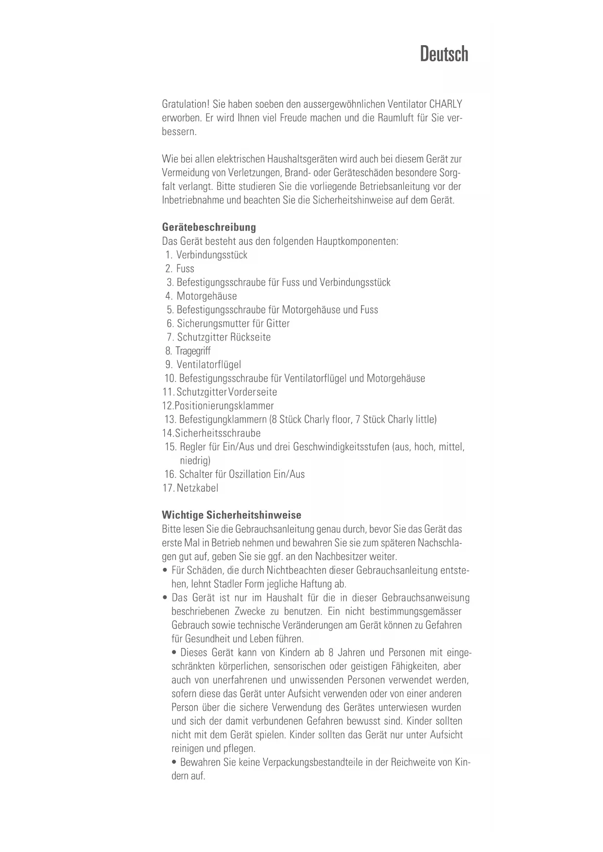 Laden Sie die Anleitung für Ihr Ventilator kostenlos im PDF-Format! Finden Sie Ihr Handbuch Charly Floor - STADLER FORM und nehmen Sie Ihr elektronisches Gerät wieder in die Hand. Auf dieser Seite sind alle Dokumente veröffentlicht, die für die Verwendung Ihres Geräts notwendig sind. Charly Floor von der Marke STADLER FORM.