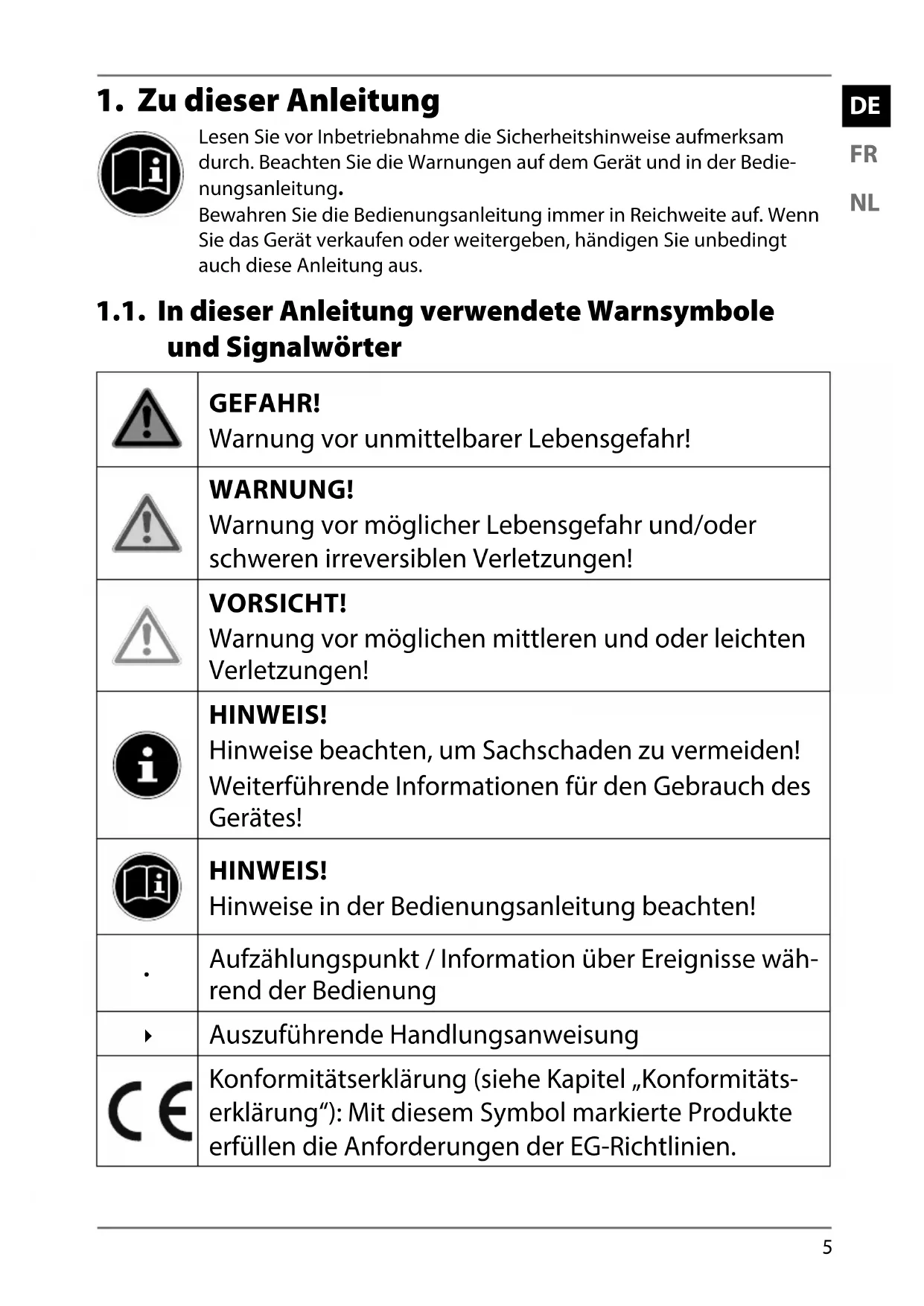 Lesen Sie vor Inbetriebnahme die Sicherheitshinweise aufmerksam durch. Beachten Sie die Warnungen auf dem Gerät und in der Bedie- nungsanleitung. Bewahren Sie die Bedienungsanleitung immer in Reichweite auf. Wenn Sie das Gerät verkaufen oder weitergeben, händigen Sie unbedingt auch diese Anleitung aus. 1.1. In dieser Anleitung verwendete Warnsymbole und Signalwörter GEFAHR! Warnung vor unmittelbarer Lebensgefahr! WARNUNG! Warnung vor möglicher Lebensgefahr und/oder schweren irreversiblen Verletzungen! VORSICHT! Warnung vor möglichen mittleren und oder leichten Verletzungen! HINWEIS! Hinweise beachten, um Sachschaden zu vermeiden! Weiterführende Informationen für den Gebrauch des Gerätes! HINWEIS! Hinweise in der Bedienungsanleitung beachten!