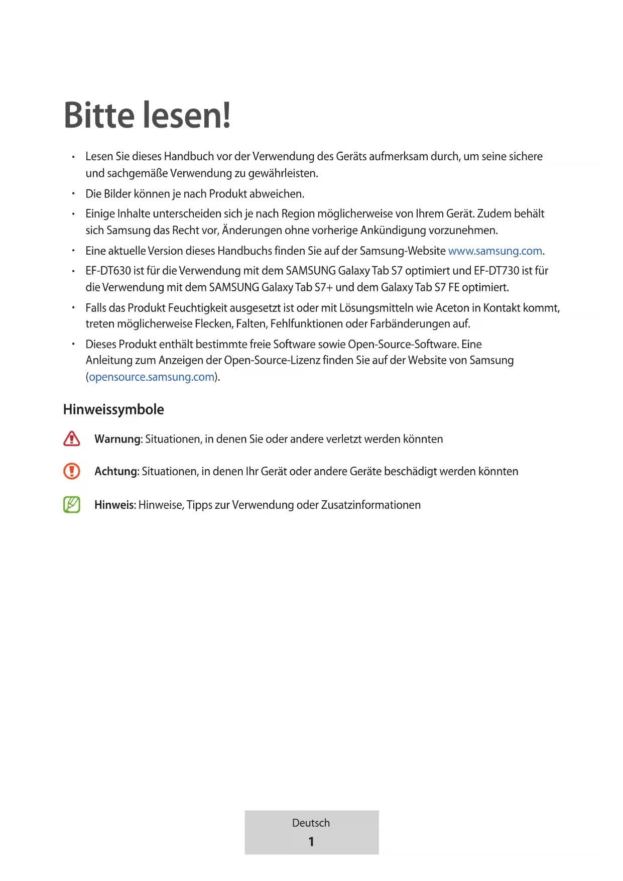 Dieses Produkt enthält bestimmte freie Software sowie Open-Source-Software. Eine Anleitung zum Anzeigen der Open-Source-Lizenz finden Sie auf der Website von Samsung (opensource.samsung.com). Hinweissymbole Warnung: Situationen, in denen Sie oder andere verletzt werden könnten Achtung: Situationen, in denen Ihr Gerät oder andere Geräte beschädigt werden könnten Hinweis: Hinweise, Tipps zur Verwendung oder Zusatzinformationen2 Deutsch Erste Schritte Lieferumfang