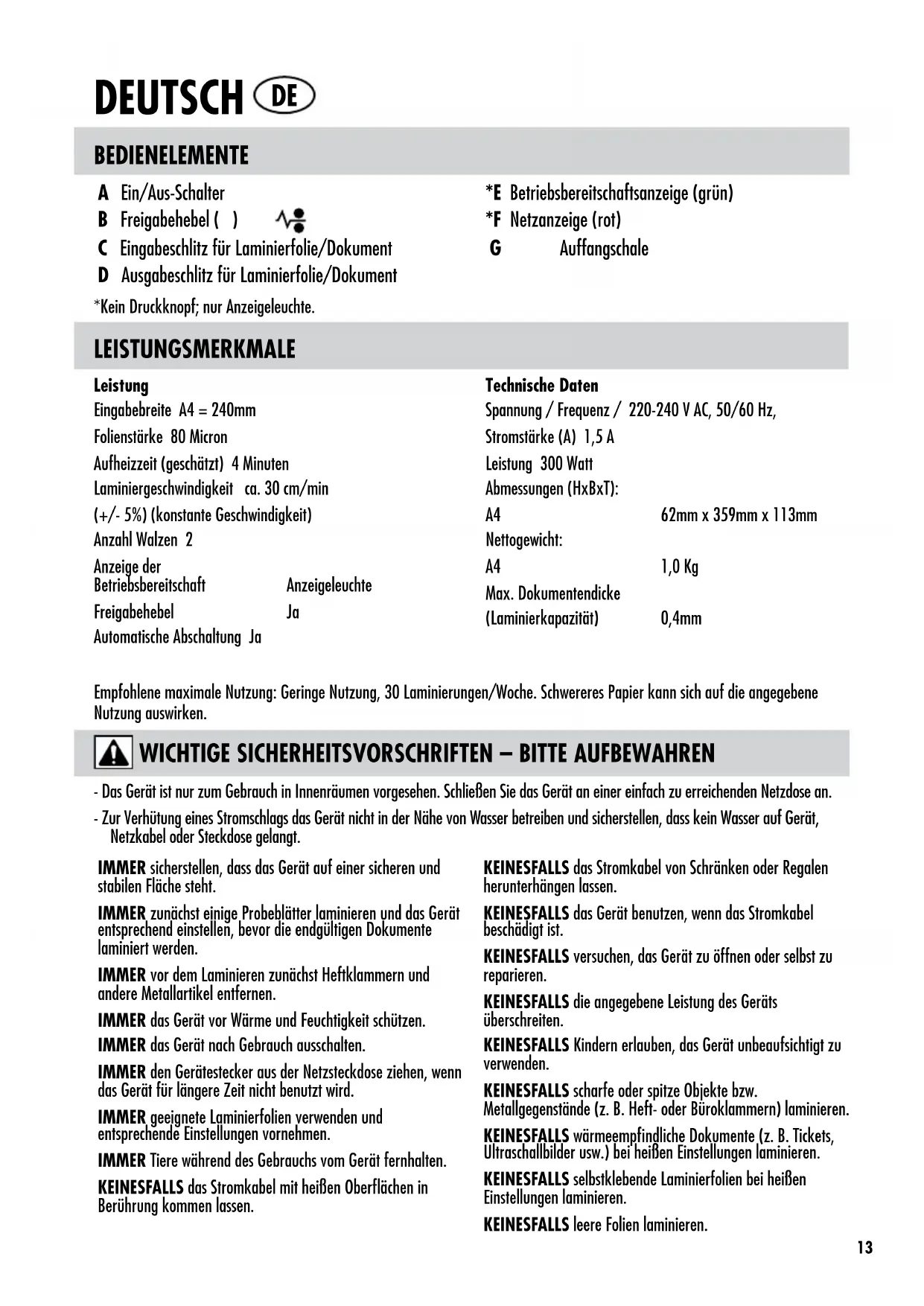 A Ein/Aus-Schalter B Freigabehebel ( ) C Eingabeschlitz für Laminierfolie/Dokument D Ausgabeschlitz für Laminierfolie/Dokument *E Betriebsbereitschaftsanzeige (grün) *F Netzanzeige (rot) G Auffangschale LEISTUNGSMERKMALE Leistung Eingabebreite A4 = 240mm Folienstärke 80 Micron Aufheizzeit (geschätzt) 4 Minuten Laminiergeschwindigkeit ca. 30 cm/min (+/- 5%) (konstante Geschwindigkeit) Anzahl Walzen 2 Anzeige der Betriebsbereitschaft Anzeigeleuchte Freigabehebel Ja Automatische Abschaltung Ja Technische Daten Spannung / Frequenz / 220-240 V AC, 50/60 Hz, Stromstärke (A) 1,5 A Leistung 300 Watt Abmessungen (HxBxT): A4 62mm x 359mm x 113mm Nettogewicht: A4 1,0 Kg Max. Dokumentendicke (Laminierkapazität) 0,4mm - Das Gerät ist nur zum Gebrauch in Innenräumen vorgesehen. Schließen Sie das Gerät an einer einfach zu erreichenden Netzdose an. - Zur Verhütung eines Stromschlags das Gerät nicht in der Nähe von Wasser betreiben und sicherstellen, dass kein Wasser auf Gerät, Netzkabel oder Steckdose gelangt. IMMER sicherstellen, dass das Gerät auf einer sicheren und stabilen Fläche steht. IMMER zunächst einige Probeblätter laminieren und das Gerät entsprechend einstellen, bevor die endgültigen Dokumente laminiert werden. IMMER vor dem Laminieren zunächst Heftklammern und andere Metallartikel entfernen. IMMER das Gerät vor Wärme und Feuchtigkeit schützen. IMMER das Gerät nach Gebrauch ausschalten. IMMER den Gerätestecker aus der Netzsteckdose ziehen, wenn das Gerät für längere Zeit nicht benutzt wird. IMMER geeignete Laminierfolien verwenden und entsprechende Einstellungen vornehmen. IMMER Tiere während des Gebrauchs vom Gerät fernhalten. KEINESFALLS das Stromkabel mit heißen Oberflächen in Berührung kommen lassen. KEINESFALLS das Stromkabel von Schränken oder Regalen herunterhängen lassen. KEINESFALLS das Gerät benutzen, wenn das Stromkabel beschädigt ist. KEINESFALLS versuchen, das Gerät zu öffnen oder selbst zu reparieren. KEINESFALLS die angegebene Leistung des Geräts überschreiten. KEINESFALLS Kindern erlauben, das Gerät unbeaufsichtigt zu verwenden. KEINESFALLS scharfe oder spitze Objekte bzw. Metallgegenstände (z. B. Heft- oder Büroklammern) laminieren. KEINESFALLS wärmeempfindliche Dokumente (z. B. Tickets, Ultraschallbilder usw.) bei heißen Einstellungen laminieren. KEINESFALLS selbstklebende Laminierfolien bei heißen Einstellungen laminieren. KEINESFALLS leere Folien laminieren. DEUTSCH