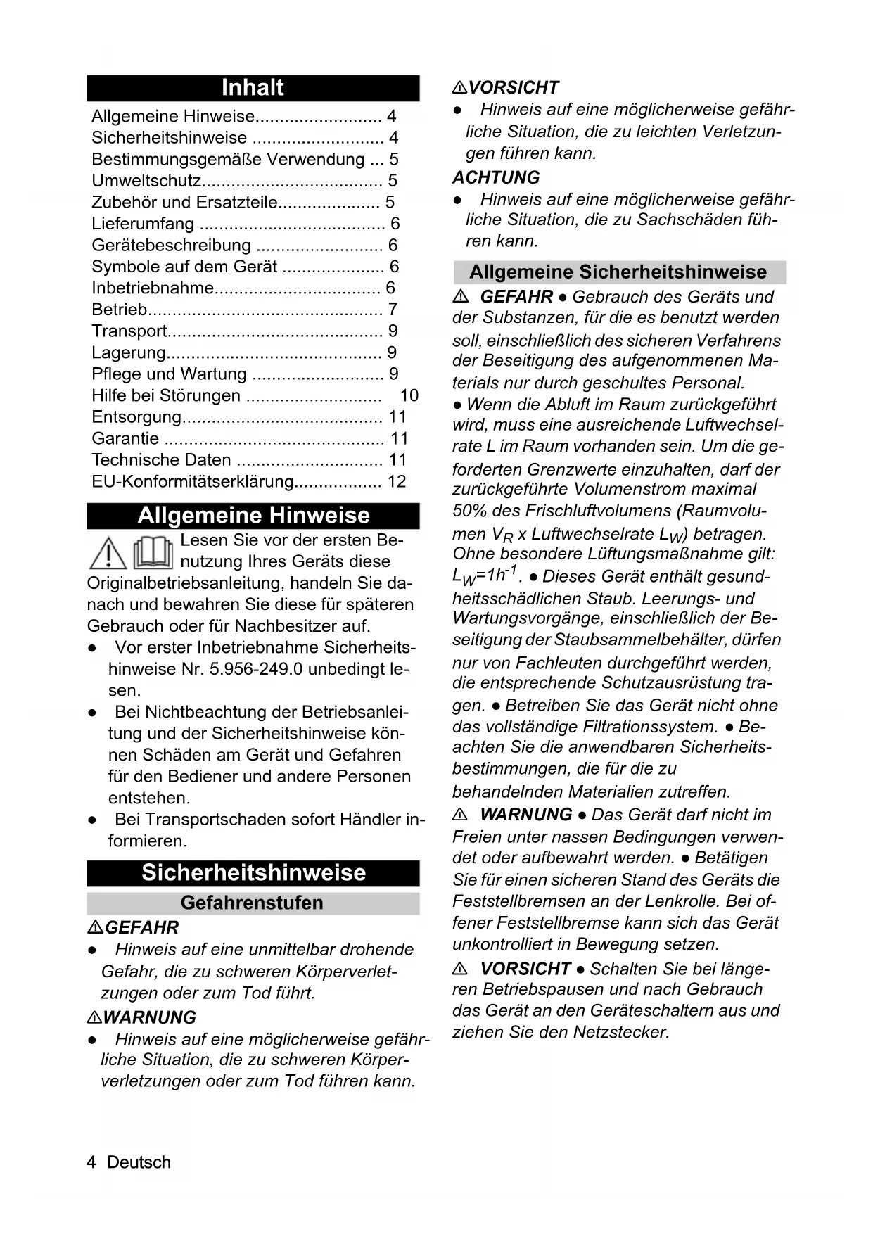 248AB C D E F G4 Deutsch Inhalt Allgemeine Hinweise Lesen Sie vor der ersten Be- nutzung Ihres Geräts diese Originalbetriebsanleitung, handeln Sie da- nach und bewahren Sie diese für späteren Gebrauch oder für Nachbesitzer auf. ● Vor erster Inbetriebnahme Sicherheits- hinweise Nr. 5.956-249.0 unbedingt le- sen. ● Bei Nichtbeachtung der Betriebsanlei- tung und der Sicherheitshinweise kön- nen Schäden am Gerät und Gefahren für den Bediener und andere Personen entstehen. ● Bei Transportschaden sofort Händler in- formieren. Sicherheitshinweise Gefahrenstufen GEFAHR ● Hinweis auf eine unmittelbar drohende Gefahr, die zu schweren Körperverlet- zungen oder zum Tod führt. 몇 WARNUNG ● Hinweis auf eine möglicherweise gefähr- liche Situation, die zu schweren Körper- verletzungen oder zum Tod führen kann. 몇 VORSICHT ● Hinweis auf eine möglicherweise gefähr- liche Situation, die zu leichten Verletzun- gen führen kann. ACHTUNG ● Hinweis auf eine möglicherweise gefähr- liche Situation, die zu Sachschäden füh- ren kann. Allgemeine Sicherheitshinweise GEFAHR ● Gebrauch des Geräts und der Substanzen, für die es benutzt werden soll, einschließlich des sicheren Verfahrens der Beseitigung des aufgenommenen Ma- terials nur durch geschultes Personal. ● Wenn die Abluft im Raum zurückgeführt wird, muss eine ausreichende Luftwechsel- rate L im Raum vorhanden sein. Um die ge- forderten Grenzwerte einzuhalten, darf der zurückgeführte Volumenstrom maximal 50% des Frischluftvolumens (Raumvolu- men V