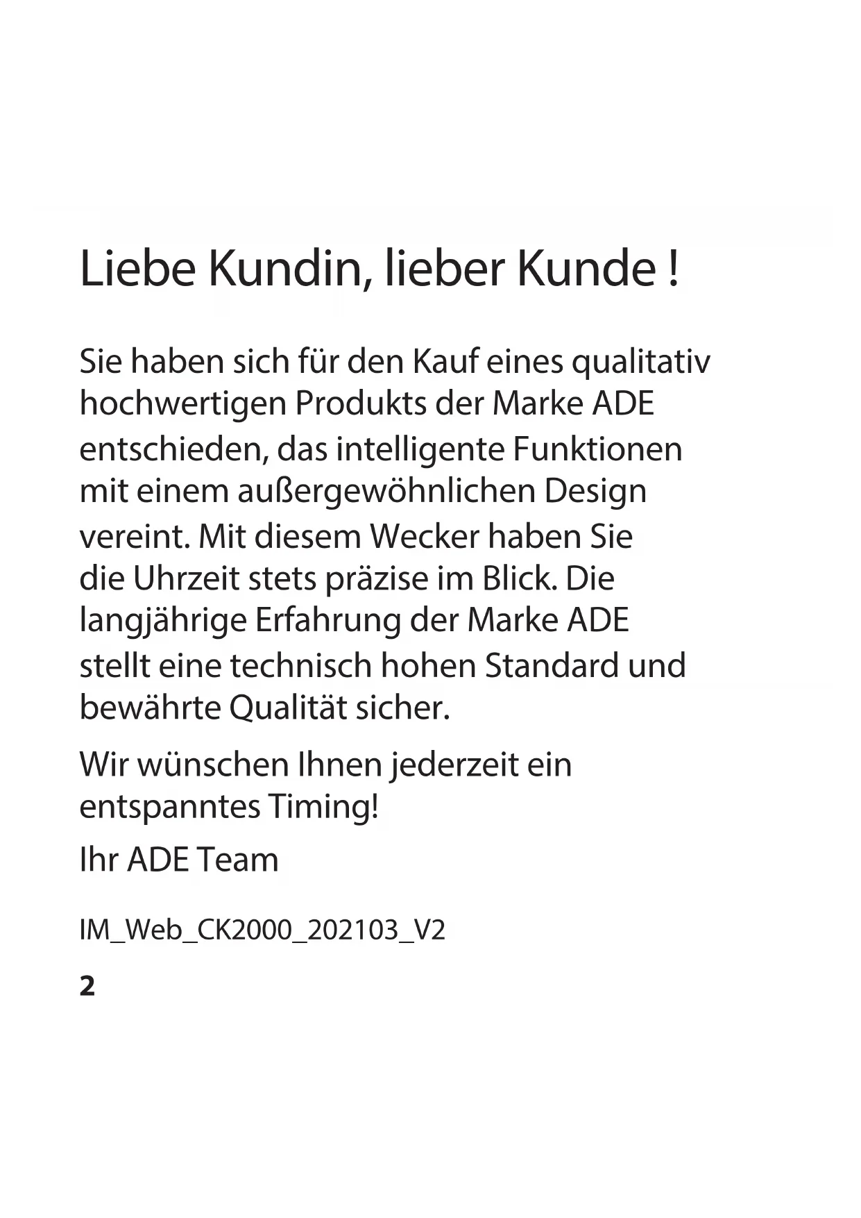 Sie haben sich für den Kauf eines qualitativ hochwertigen Produkts der Marke ADE entschieden, das intelligente Funktionen mit einem außergewöhnlichen Design vereint. Mit thisem Wecker haben Sie die Uhrzeit stets prazise im Blick. Die langjährige Erfahrung der Marke ADE besteht eine technisch hohen Standard und bewährte Qualität sicher.