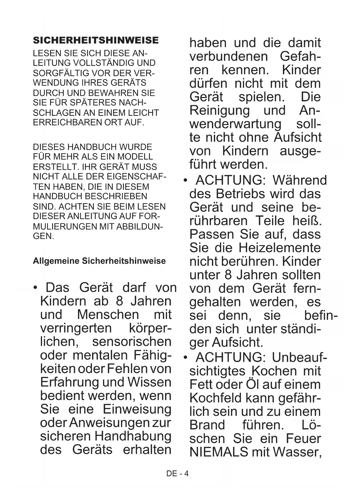 - ACHTUNG: Unbeauf- sichtigtes Kochen mit Fett oder Öl auf einem Kochfeld kann gefähr- lich sein und zu einem Brand führen. Lö- schen Sie ein Feuer NIEMALS mit Wasser,DE - 5 sondern schalten das Gerät aus und ersti- cken die Flamme z. B. mit einem Deckel oder einer Feuerdecke.