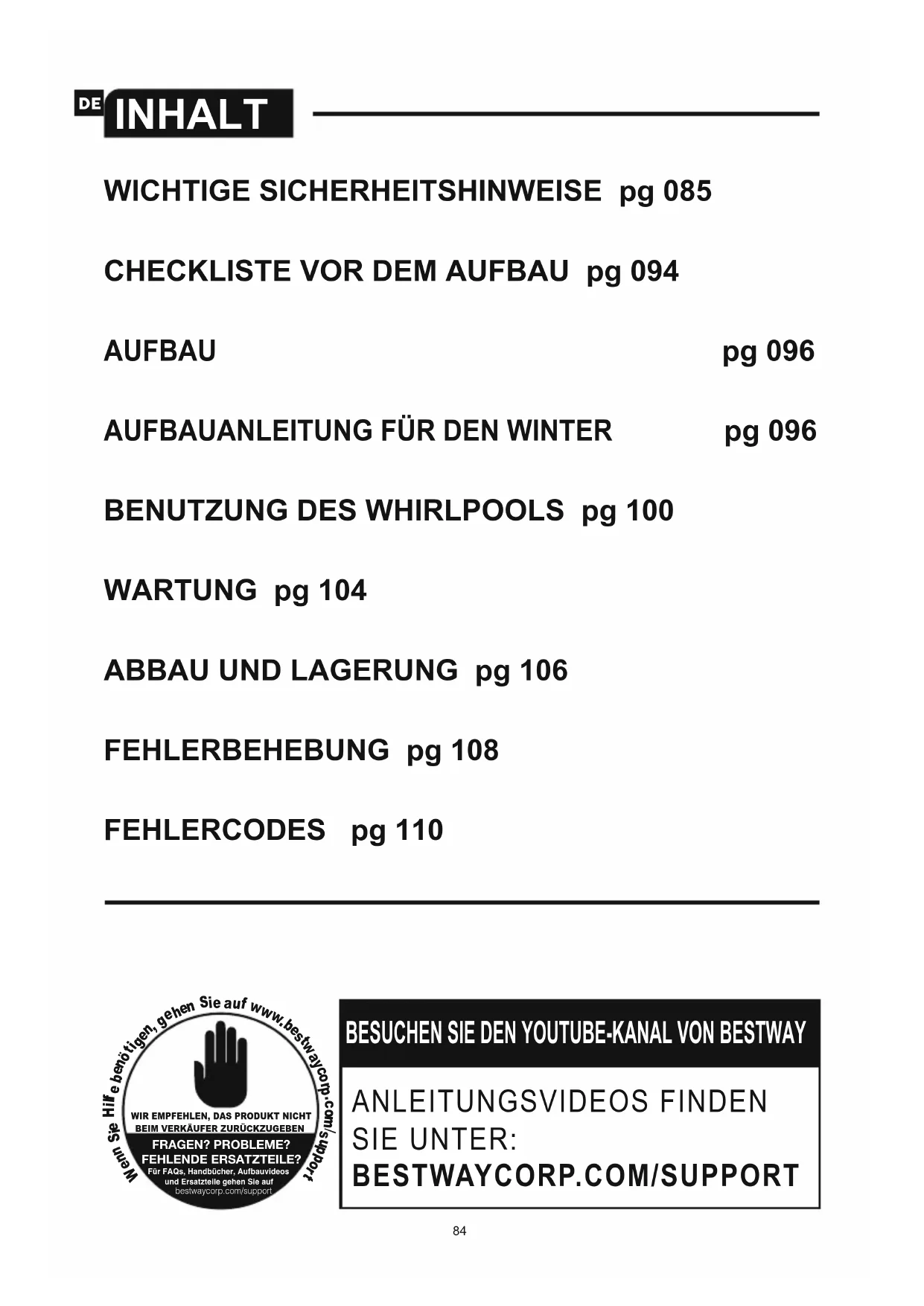 WIR EMPFEHLEN, DAS PRODUKT NICHTBEIM VERKÄUFER ZURÜCKZUGEBENFRAGEN? PROBLEME?FEHLENDE ERSATZTEILE?Für FAQs, Handbücher, Aufbauvideos und Ersatzteile gehen Sie auf bestwaycorp.com/support WICHTIGE SICHERHEITSHINWEISE pg 085CHECKLISTE VOR DEM AUFBAU pg 094AUFBAU pg 096AUFBAUANLEITUNG FÜR DEN WINTER pg 096BENUTZUNG DES WHIRLPOOLS pg 100WARTUNG pg 104ABBAU UND LAGERUNG pg 106FEHLERBEHEBUNG pg 108FEHLERCODES pg 110SICHERHEITSANWEISUNGEN Lesen, verstehen und beachten Sie sämtliche Hinweise in dieser Bedienungsanleitung, bevor Sie den Whirlpool aufstellen und verwenden.