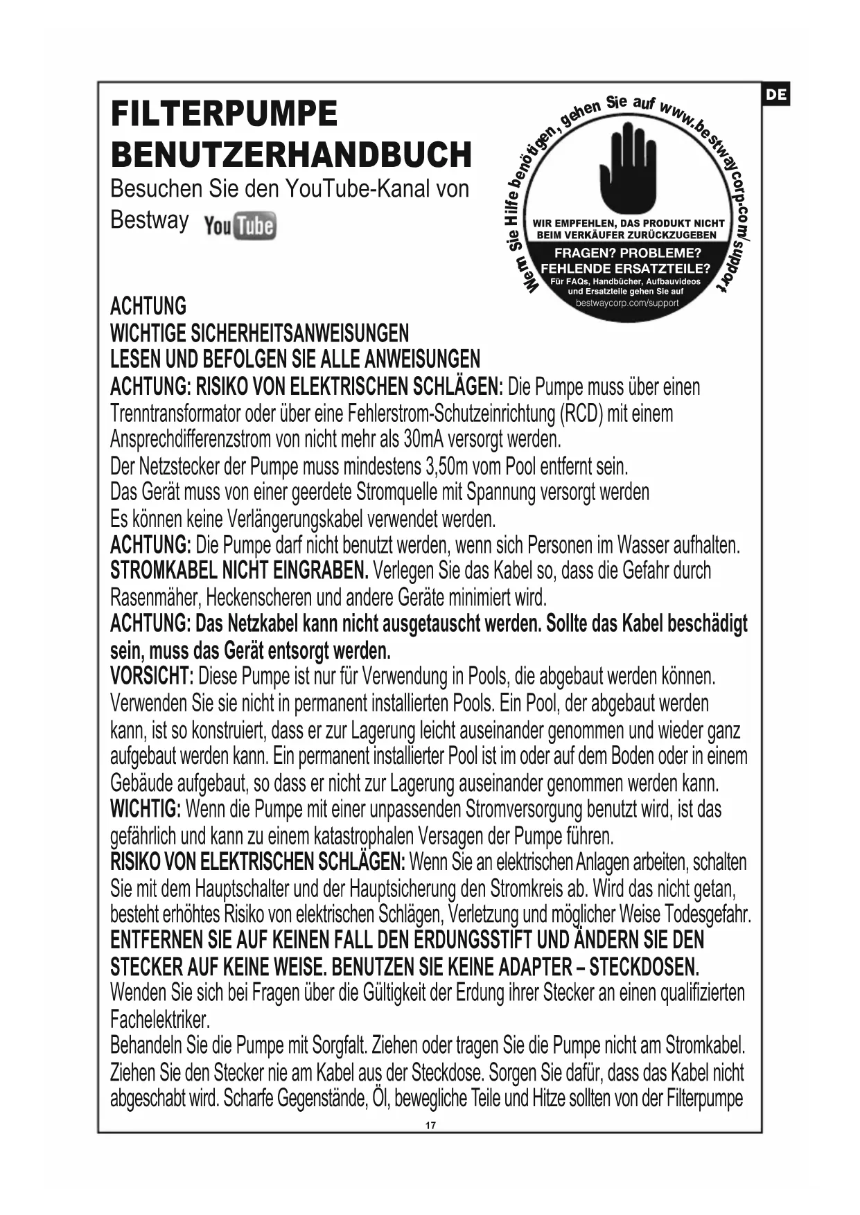 - Wenn Sie das Produkt während des Urlaubs unbeaufsichtigt lassen Bewahren Sie diese Anweisungen sorgfältig auf. Beachten Sie bei jedem erneuten Aufbau des Pools diese Anweisungen. Sollten diese Anweisungen verloren gehen, kontaktieren Sie Bestway oder suchen Sie das Dokument auf unserer Website: www.bestwaycorp.com ANMERKUNG: Dieses Produkt darf nicht für kommerzielle Zwecke benutzt werden. Bitte lesen Sie das Handbuch sorgfältig durch und bewahren Sie es als künftige Referenz auf. BEWAHREN SIE DIESE ANWEISUNGEN AUF. FILTERPUMPE BENUTZERHANDBUCH Besuchen Sie den YouTube-Kanal von Bestway