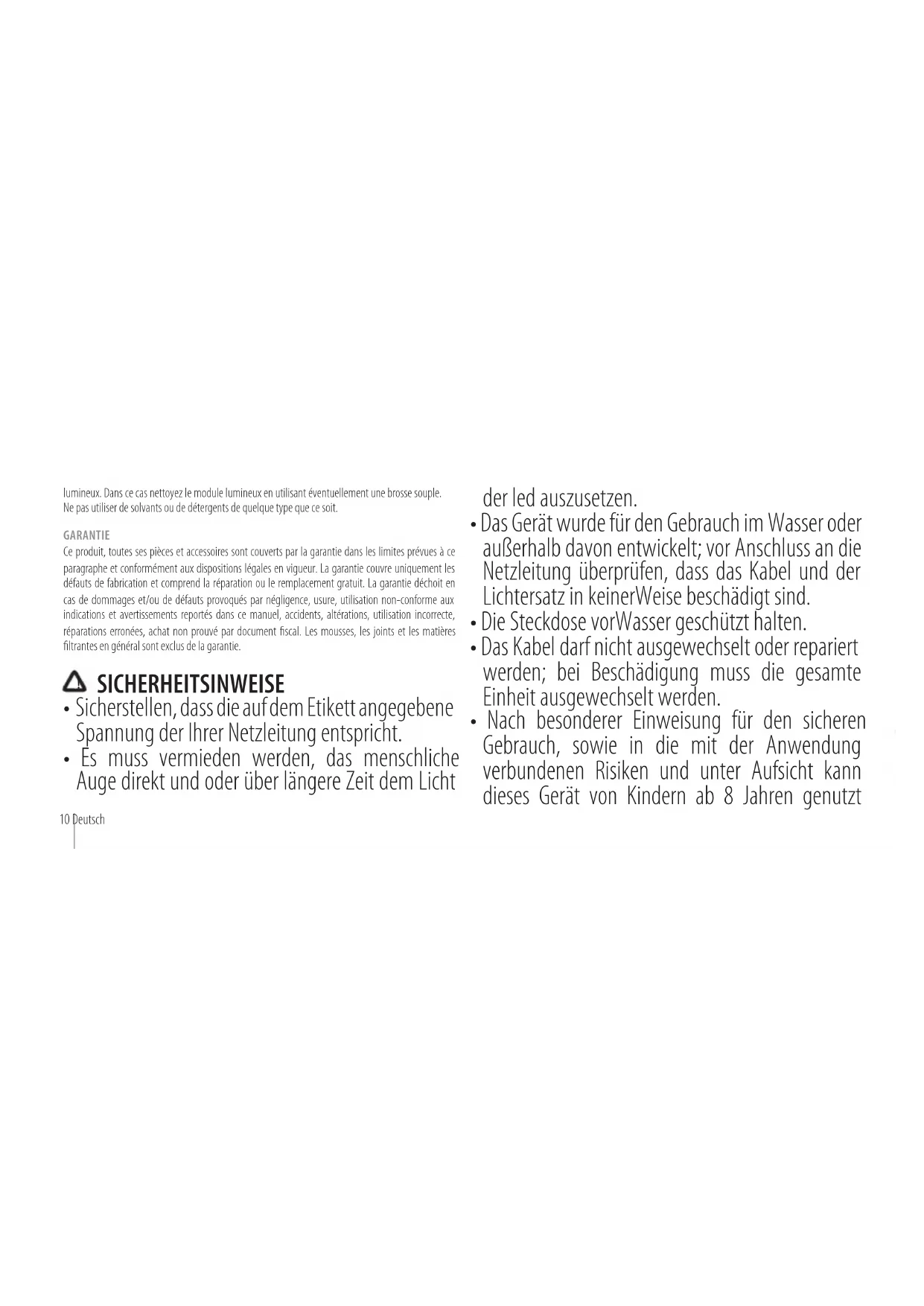 - Das Gerät wurde für den Gebrauch im Wasser oder außerhalb davon entwickelt; vor Anschluss an die Netzleitung überprüfen, dass das Kabel und der Lichtersatz in keiner Weise beschädigt sind.