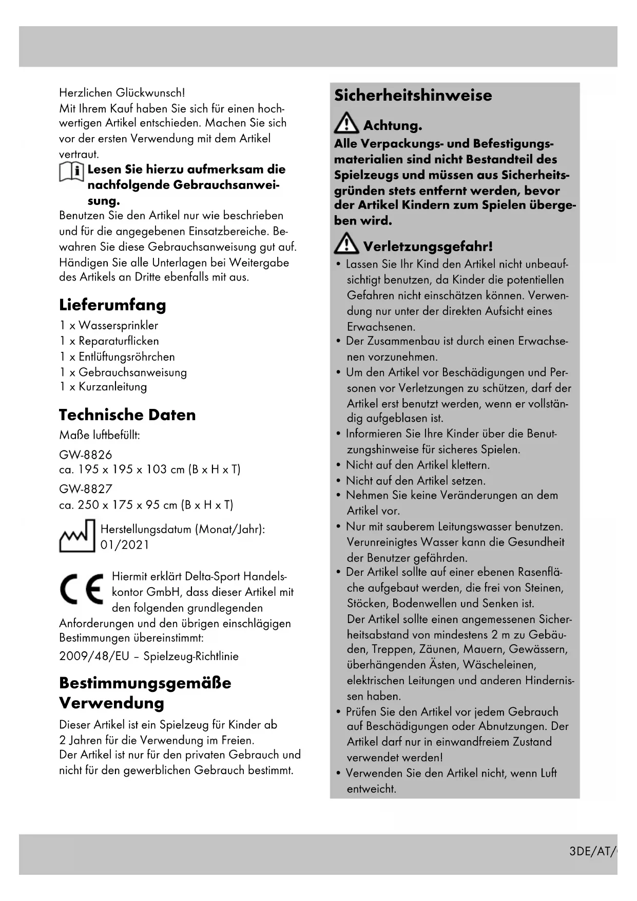 E3DE/AT/CH Herzlichen Glückwunsch! Mit Ihrem Kauf haben Sie sich für einen hoch- wertigen Artikel entschieden. Machen Sie sich vor der ersten Verwendung mit dem Artikel vertraut. Lesen Sie hierzu aufmerksam die nachfolgende Gebrauchsanwei- sung. Benutzen Sie den Artikel nur wie beschrieben und für die angegebenen Einsatzbereiche. Be- wahren Sie diese Gebrauchsanweisung gut auf. Händigen Sie alle Unterlagen bei Weitergabe des Artikels an Dritte ebenfalls mit aus. Lieferumfang 1 x Wassersprinkler 1 x Reparaturflicken 1 x Entlüftungsröhrchen 1 x Gebrauchsanweisung 1 x Kurzanleitung Technische Daten Maße luftbefüllt: GW-8826 ca. 195 x 195 x 103 cm (B x H x T) GW-8827 ca. 250 x 175 x 95 cm (B x H x T) Herstellungsdatum (Monat/Jahr): 01/2021 Hiermit erklärt Delta-Sport Handels- kontor GmbH, dass dieser Artikel mit den folgenden grundlegenden Anforderungen und den übrigen einschlägigen Bestimmungen übereinstimmt: 2009/48/EU – Spielzeug-Richtlinie Bestimmungsgemäße Verwendung Dieser Artikel ist ein Spielzeug für Kinder ab 2 Jahren für die Verwendung im Freien. Der Artikel ist nur für den privaten Gebrauch und nicht für den gewerblichen Gebrauch bestimmt. Sicherheitshinweise Achtung. Alle Verpackungs- und Befestigungs- materialien sind nicht Bestandteil des Spielzeugs und müssen aus Sicherheits- gründen stets entfernt werden, bevor der Artikel Kindern zum Spielen überge- ben wird. Verletzungsgefahr!