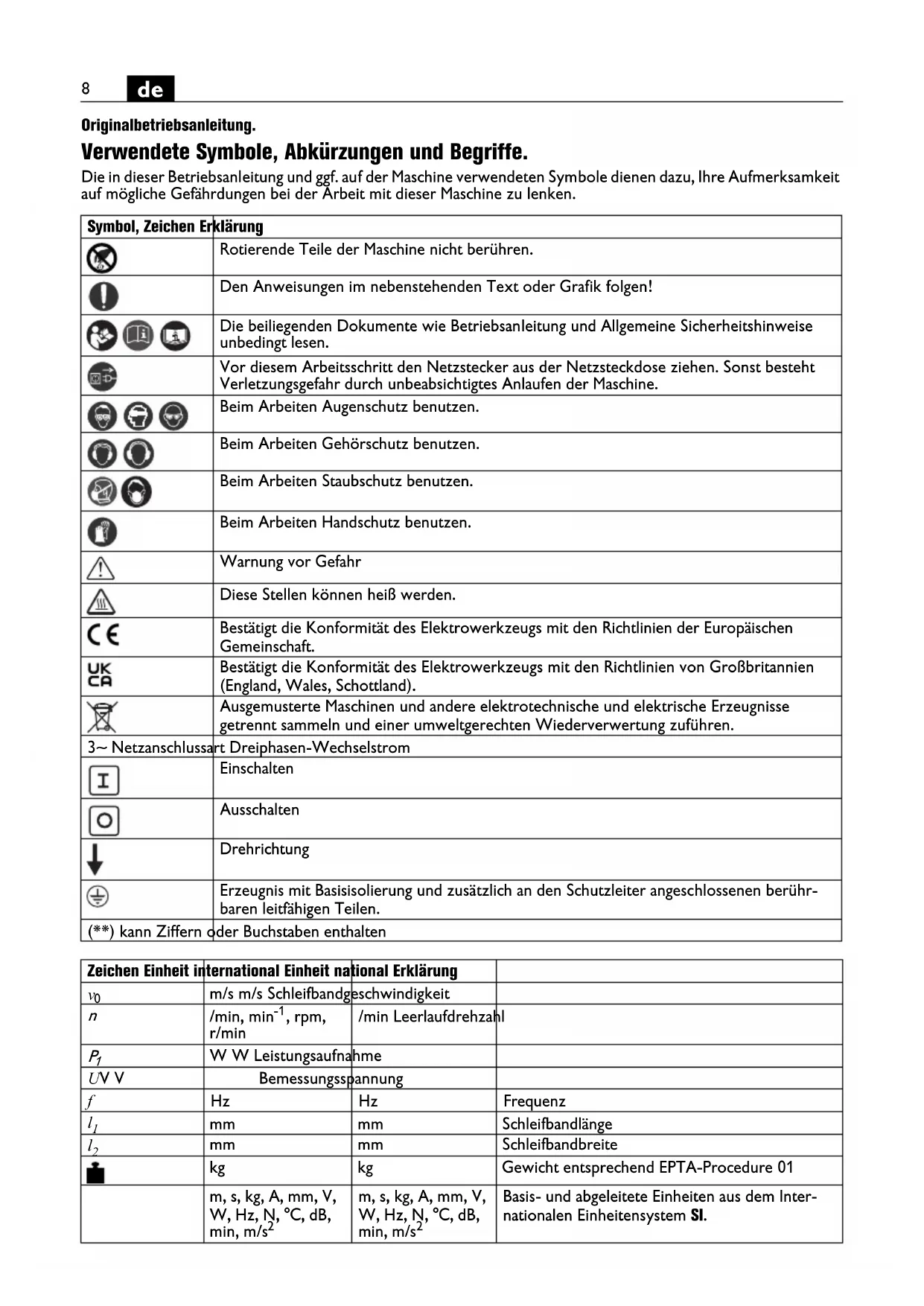 Originalbetriebsanleitung. Verwendete Symbole, Abkürzungen und Begriffe. Die in dieser Betriebsanleitung und ggf. auf der Maschine verwendeten Symbole dienen dazu, Ihre Aufmerksamkeit auf mögliche Gefährdungen bei der Arbeit mit dieser Maschine zu lenken. Symbol, Zeichen Erklärung Rotierende Teile der Maschine nicht berühren. Den Anweisungen im nebenstehenden Text oder Grafik folgen! Die beiliegenden Dokumente wie Betriebsanleitung und Allgemeine Sicherheitshinweise unbedingt lesen. Vor diesem Arbeitsschritt den Netzstecker aus der Netzsteckdose ziehen. Sonst besteht Verletzungsgefahr durch unbeabsichtigtes Anlaufen der Maschine. Beim Arbeiten Augenschutz benutzen. Beim Arbeiten Gehörschutz benutzen. Beim Arbeiten Staubschutz benutzen. Beim Arbeiten Handschutz benutzen. Warnung vor Gefahr Diese Stellen können heiß werden. Bestätigt die Konformität des Elektrowerkzeugs mit den Richtlinien der Europäischen Gemeinschaft. Bestätigt die Konformität des Elektrowerkzeugs mit den Richtlinien von Großbritannien (England, Wales, Schottland). Ausgemusterte Maschinen und andere elektrotechnische und elektrische Erzeugnisse getrennt sammeln und einer umweltgerechten Wiederverwertung zuführen. 3~ Netzanschlussart Dreiphasen-Wechselstrom Einschalten Ausschalten Drehrichtung Erzeugnis mit Basisisolierung und zusätzlich an den Schutzleiter angeschlossenen berühr- baren leitfähigen Teilen. (**) kann Ziffern oder Buchstaben enthalten Zeichen Einheit international Einheit national Erklärung